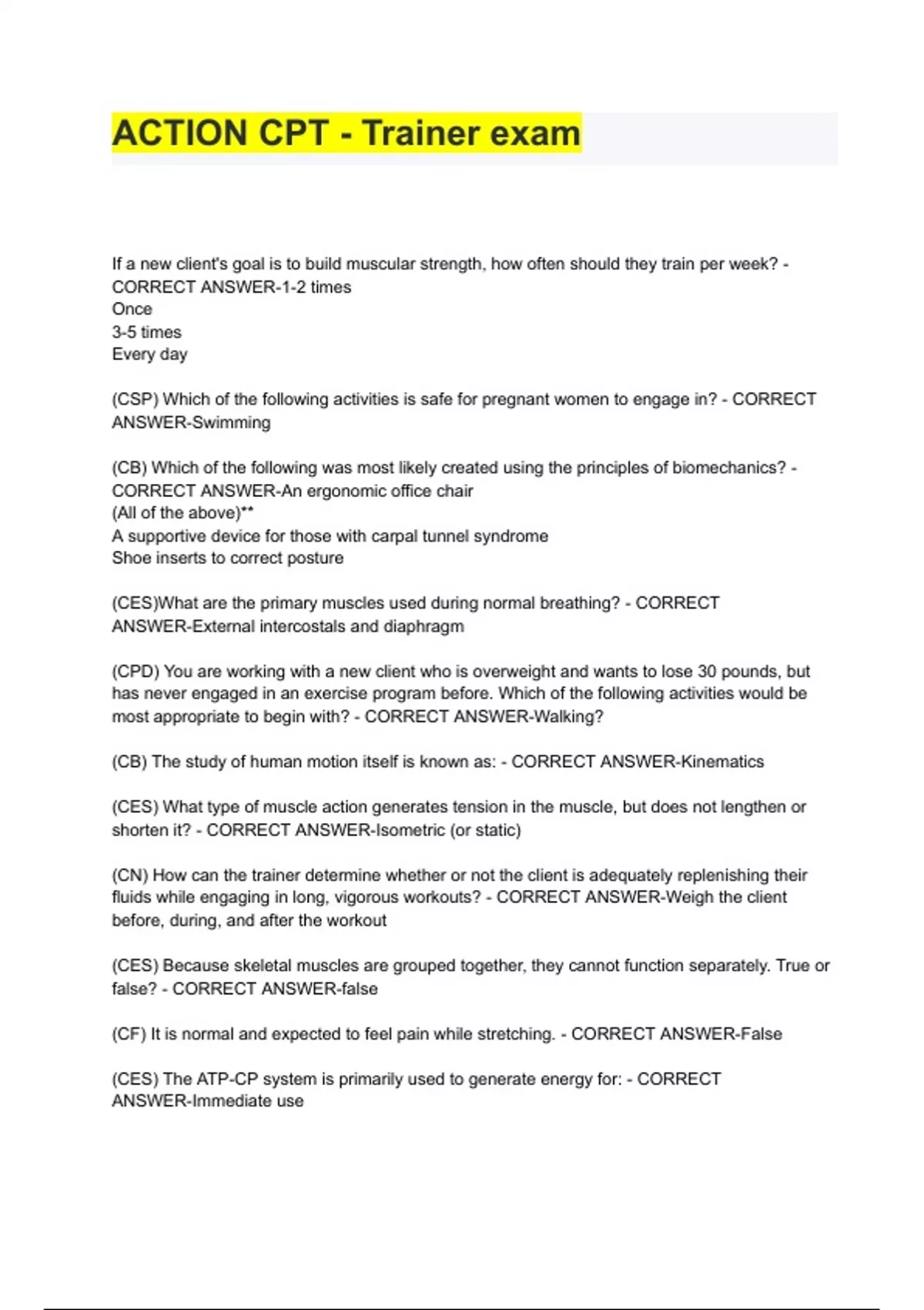 If a new client's goal is to build muscular strength, how often should they train per week? - 1-2 times Once 3-5 times Every day (CSP) Which of the following activities is safe for pregnant women to engage in? -Swimming (CB) Which of the following was most likely created using the principles of biomechanics? - An ergonomic office chair (All of the above)** A supportive device for those with carpal tunnel syndrome Shoe inserts to correct posture (CES)What are the primary muscles used during normal breathing? - External intercostals and diaphragm (CPD) You are working with a new client who is overweight and wants to lose 30 pounds, but has never engaged in an exercise program before. Which of the following activities would be most appropriate to begin with? - Walking? (CB) The study of human motion itself is known as: -Kinematics (CES) What type of muscle action generates tension in the muscle, but does not lengthen or shorten it? - Isometric (or static) (CN) How can the trainer determine whether or not the client is adequately replenishing their fluids while engaging in long, vigorous workouts? - Weigh the client before, during, and after the workout(CES) Because skeletal muscles are grouped together, ACTION CPT - Trainer exam