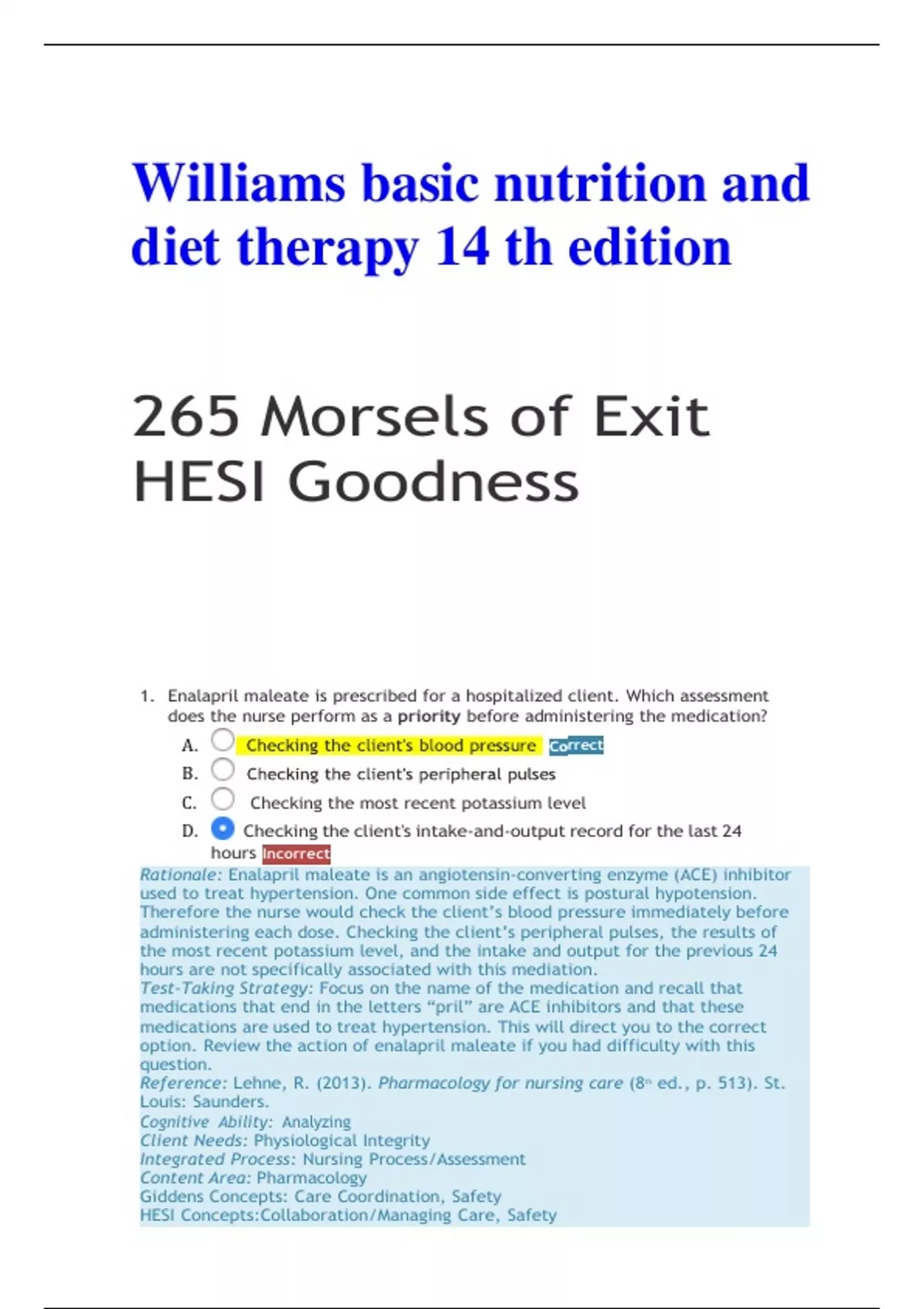 Williams basic nutrition and diet therapy 14 th edition 265 Morsels of Exit HESI Goodness 1. Enalapril maleate is prescribed for a hospitalized client. Which assessment does the nurse perform as a priority before administering the medication? rrect C. Checking the most recent potassium level D. Checking the client's intake-and-output record for the last 24 hours Incorrect A. B. Rationale: Enalapril maleate is an angiotensin-converting enzyme (ACE) inhibitor used to treat hypertension. One common side effect is postural hypotension. Therefore the nurse would check the client’s blood pressure immediately before administering each dose. Checking the client’s peripheral pulses, the results of the most recent potassium level, and the intake and output for the previous 24 hours are not specifically associated with this mediation. Test-Taking Strategy: Focus on the name of the medication and recall that medications that end in the letters “pril” are ACE inhibitors and that these medications are used to treat hypertension. This will direct you to the correct option. Review the action of enalapril maleate if you had difficulty with this question. Reference: Lehne, R. (2013). Pharmacology for nursing care (8th ed., p. 513). St. Louis: Saunders. Cognitive Ability: Analyzing Client Needs: Physiological Integrity Integrated Process: Nursing Process/Assessment Content Area: Pharmacology Giddens Concepts: Care Coordination, Safety HESI Concepts:Collaboration/Managing Care, Safety Awarded 0.0 points out of 1.0 possible points. 2. ID: A client is scheduled to undergo an upper gastrointestinal (GI) series, and the nurse provides instructions to the client about the test. Which statement by the client indicates a need for further instruction? A. "The test will take about 30 minutes." B. "I need to fast for 8 hours before the test." Incorrect C. "I need to drink citrate of magnesia the night before the test and give myself a Fleet enema on the morning of the test." Correct D. "I need to take a laxative after the test is completed, because the liquid that I’ll have to drink for the test can be constipating." Rationale: An upper GI series involves visualization of the esophagus, duodenum, and upper jejunum by means of the use of a contrast medium. It involves swallowing a contrast medium (usually barium), which is administered in a flavored milkshake. Films are taken at intervals during the test, which takes about 30 minutes. No special preparation is necessary before a GI series, except that NPO status must be maintained for 8 hours before the test. After an upper GI Awarded 0.0 points out of 1.0 possible points. 3. ID: A nurse on the evening shift checks a health care provider's prescriptions and notes that the dose of a prescribed medication is higher than the normal dose. The nurse calls the health care provider's answering service and is told that the health care provider is off for the night and will be available in the morning. The nurse should: A. Call the nursing supervisor B. Ask the answering service to contact the on-call health care provider Correct C. Withhold the medication until the health care provider can be reached in the morning D. Administer the medication but consult the health care provider when he becomes available series, the client is prescribed a laxative to hasten elimination of the barium. Barium that remains in the colon may become hard and difficult to expel, leading to fecal impaction. Test-Taking Strategy: Use the process of elimination. Note the strategic words "need for further instruction." These words indicate a negative event query and the need to select the incorrect client statement. Focusing on the word "upper" in the name of the test will direct you to the correct option. Review preprocedure care for an upper GI series if you had difficulty with this question. Reference: Lewis, S., Dirksen, S., Heitkemper, M., & Bucher, L. (2014). Medical- surgical nursing: Assessment and management of clinical problems (9th ed., p. 879). St. Louis: Mosby. Cognitive Ability: Evaluating Client Needs: Physiological Integrity Integrated Process: Teaching and Learning Content Area: Adult Health/Gastrointestinal Giddens Concepts: Client Education, Clinical Judgment HESI Concepts:Clinical Decision Making/Clinical Judgment, Teaching and Learning/Patient Education