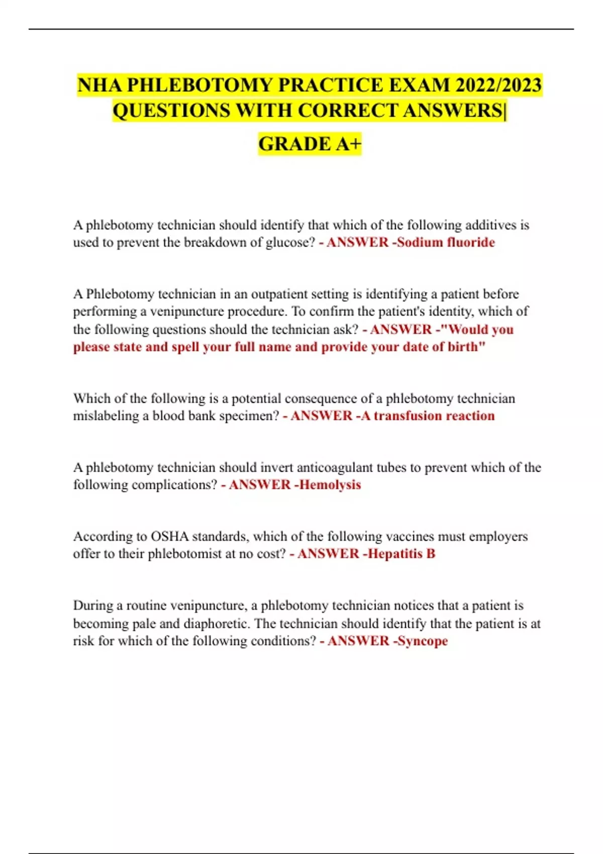 NHA PHLEBOTOMY PRACTICE EXAM 2022/2023 QUESTIONS WITH CORRECT ANSWERS|GRADE A+ NHA PHLEBOTOMY PRACTICE EXAM 2022/2023 QUESTIONS WITH CORRECT ANSWERS|GRADE A+ NHA PHLEBOTOMY PRACTICE EXAM 2022/2023 QUESTIONS WITH CORRECT ANSWERS|GRADE A+