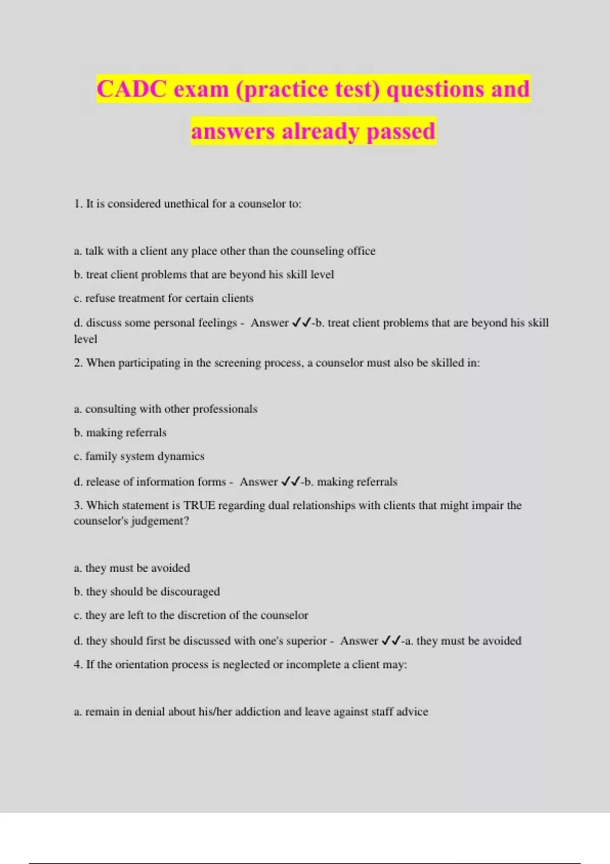 CADC exam (practice test) questions and answers already passed 1. It is considered unethical for a counselor to: a. talk with a client any place other than the counseling office b. treat client problems that are beyond his skill level c. refuse treatment for certain clients d. discuss some personal feelings - Answer ️️ -b. treat client problems that are beyond his skill level 2. When participating in the screening process, a counselor must also be skilled in: a. consulting with other professionals b. making referrals c. family system dynamics d. release of information forms - Answer ️️ -b. making referrals 3. Which statement is TRUE regarding dual relationships with clients that might impair the counselor's judgement? a. they must be avoided b. they should be discouraged c. they are left to the discretion of the counselor d. they should first be discussed with one's superior - Answer ️️ -a. they must be avoided 4. If the orientation process is neglected or incomplete a client may: a. remain in denial about his/her addiction and leave against staff advice b. have incorrect information and unanswered questions about the program c. need to be referred to an outside agency for additional counseling d. need additional education about addiction and its effects on the body. - Answer ️️ -b. have incorrect information and unanswered questions about the program 5. A common error that counselors make when conducting an assessment is: a. processing the data collected from the client b. asking too many questions and interrupting the client c. moving too quickly from data collection to treatment planning d. focusing on strengths and weaknesses rather than relationships - Answer ️️ -c. moving too quickly from data collection to treatment planning 6. Which of the following is essential for successful recovery from addiction? a. admitting to a drinking and/or drug problem b. working all 12 steps of a 12-step program c. inpatient treatment and aftercare d. resolving family issues - Answer ️️ -a. admitting to a drinking and/or drug problem 7. Interventions by a group counselor should: a. be governed by group content as outlined during the orientation process b. address issues critical to the functioning of the group as a whole c. disregard the group process when it is deemed necessary d. only be made to halt potential violence - Answer ️️ -b. address issues critical to the functioning of the group as a whole 8. When clients ask directly for advice, it is usually helpful for counselors to: a. avoid offering advice, since it negatively effects communication with the client b. encourage the client to explore various alternatives c. discuss with the client his/her request for a
