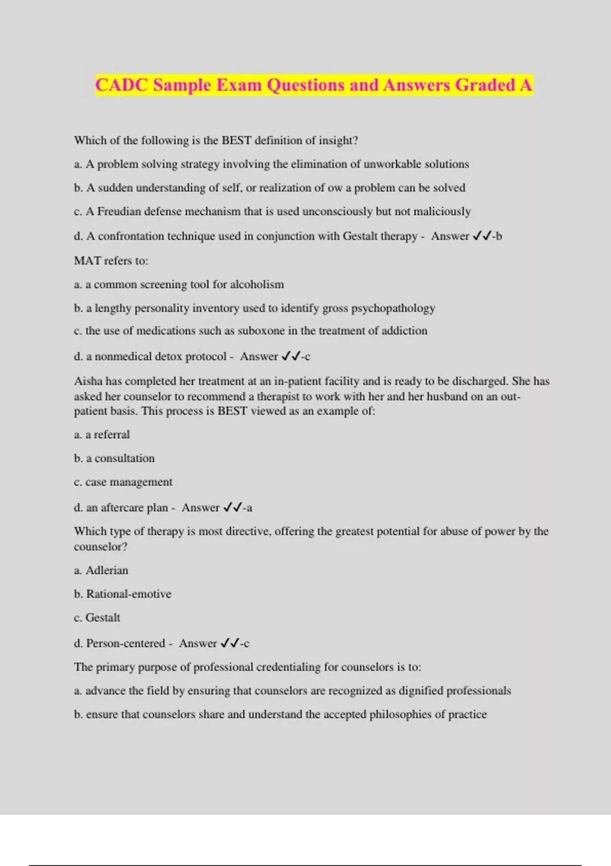 CADC Sample Exam Questions and Answers Graded A Which of the following is the BEST definition of insight? a. A problem solving strategy involving the elimination of unworkable solutions b. A sudden understanding of self, or realization of ow a problem can be solved c. A Freudian defense mechanism that is used unconsciously but not maliciously d. A confrontation technique used in conjunction with Gestalt therapy - Answer ️️ -b MAT refers to: a. a common screening tool for alcoholism b. a lengthy personality inventory used to identify gross psychopathology c. the use of medications such as suboxone in the treatment of addiction d. a nonmedical detox protocol - Answer ️️ -c Aisha has completed her treatment at an in-patient facility and is ready to be discharged. She has asked her counselor to recommend a therapist to work with her and her husband on an out- patient basis. This process is BEST viewed as an example of: a. a referral b. a consultation c. case management d. an aftercare plan - Answer ️️ -a Which type of therapy is most directive, offering the greatest potential for abuse of power by the counselor? a. Adlerian b. Rational-emotive c. Gestalt d. Person-centered - Answer ️️ -c The primary purpose of professional credentialing for counselors is to: a. advance the field by ensuring that counselors are recognized as dignified professionals b. ensure that counselors share and understand the accepted philosophies of practice c. protect public safety by ensuring that counselors meet minimum standards of competency d. ensure that counselors receiving third-party payments have professional credentials - Answer ️️ -c Which of the following is NOT a CNS depressant? a. Alcohol b. Xanax c. Nembutal d. Benzedrine - Answer ️️ -d The concept of informed consent requires that before agreeing to accept treatment, clients should know their rights and obligations, therapeutic goals, fees for services and a. availability of referral services b. community resources to be used c. with whom they will be participating in group activities d. the limits of their confidentiality - Answer ️️ -d Attitudes, policies, and practices that are destructive to other cultures and their members are examples of lack of cultural a. blindness b. competence c. destructiveness d. incapacity - Answer ️️ -b Restlessness, nervousness, flushed face, muscle twitching, tachycardia, or cardiac arrhythmia are all signs or symptoms of: a. caffeine intoxication b. cocaine intoxication c. alcohol intoxication d. opioid intoxication - Answer ️️ -a Of all of the possible substance use disorders, which one is typically not seen in older children or adults? a. cannabis use disorder b. inhalant use disorder c. tobacco use disorder d. caffeine use disorder - Answer ️️ -b Needle exchange programs can BEST be described as: a. a nonabstinence technique b. harm reduction c a maintenance method d. a community organization intervention - Answer ️️ -b Autonomic hyperactivity, hand tremor, nausea or vomiting, psychomotor agitation, grand mal seizures are all signs or symptoms of: a. cannabis withdrawal b. cocaine withdrawal c. sedative, hypnotic, or anxiolytic withdrawal d. opioid withdrawal - Answer ️️ -c Among other things, _____ involves making a client aware of resources in the community, as well as providing information related to substance abuse, HIV/AIDS and other STDs a. case management b. referral c. client education d. consultation - Answer ️️ -c In the United States the population that experiences t