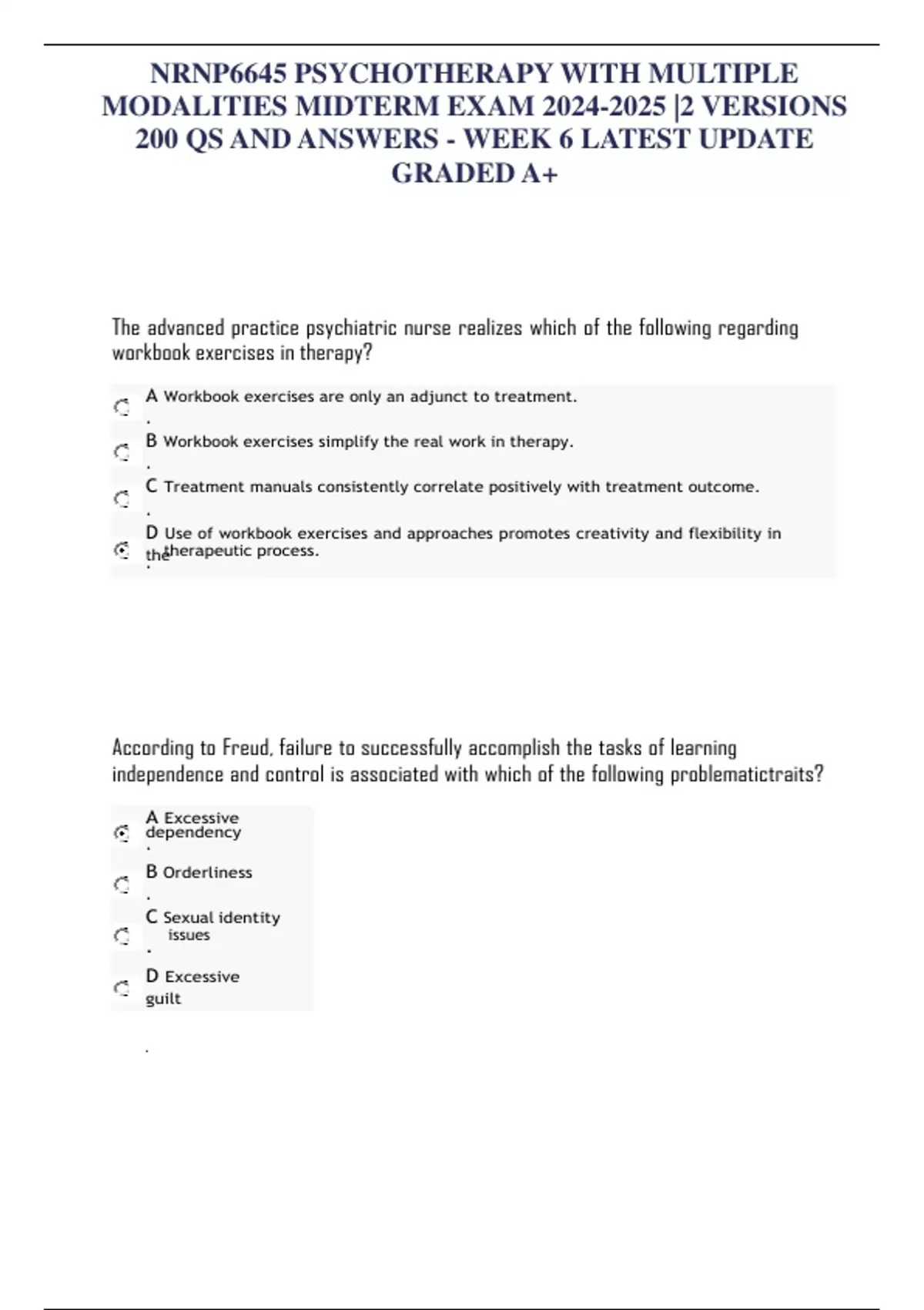 NRNP6645 PSYCHOTHERAPY WITH MULTIPLE MODALITIES MIDTERM EXAM |2 VERSIONS 200 QS AND ANSWERS - WEEK 6 LATEST UPDATE GRADED A+