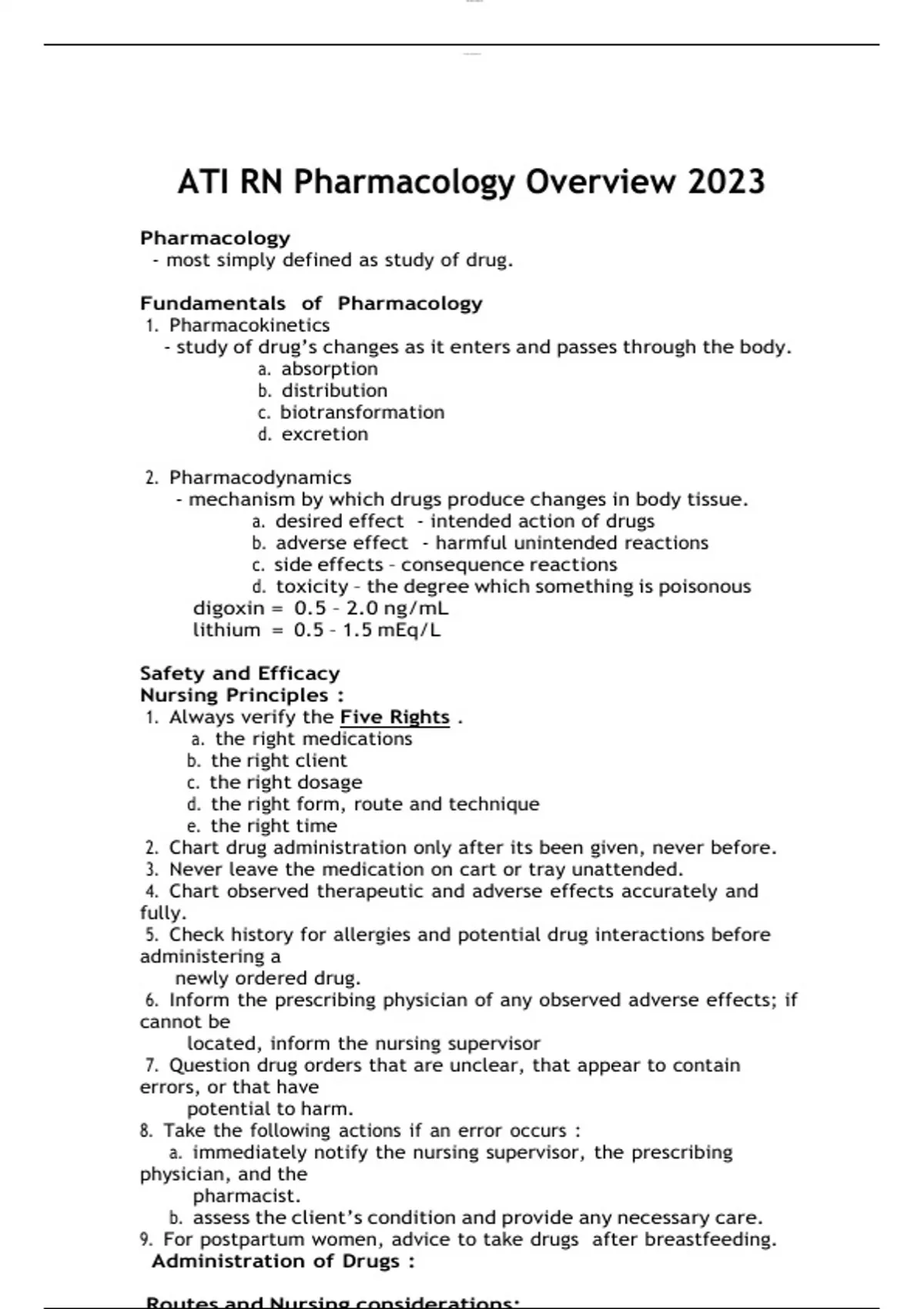 Pharmacology - most simply defined as study of drug. Fundamentals of Pharmacology 1. Pharmacokinetics - study of drug’s changes as it enters and passes through the body. a. absorption b. distribution c. biotransformation d. excretion 2. Pharmacodynamics - mechanism by which drugs produce changes in body tissue. a. desired effect - intended action of drugs b. adverse effect - harmful unintended reactions c. side effects – consequence reactions d. toxicity – the degree which something is poisonous digoxin = 0.5 – 2.0 ng/mL lithium = 0.5 – 1.5 mEq/L Safety and Efficacy Nursing Principles : 1. Always verify the Five Rights . a. the right medications b. the right client c. the right dosage d. the right form, route and technique e. the right time 2. Chart drug administration only after its been given, never before. 3. Never leave the medication on cart or tray unattended. 4. Chart observed therapeutic and adverse effects accurately and fully. 5. Check history for allergies and potential drug interactions before administering a newly ordered drug. 6. Inform the prescribing physician of any observed adverse effects; if cannot be located, inform the nursing supervisor 7. Question drug orders that are unclear, that appear to contain errors, or that have potential to harm. 8. Take the following actions if an error occurs : a. immediately notify the nursing supervisor, the prescribing physician, and the pharmacist. b. assess the client’s condition and provide any necessary care. 9. For postpartum women, advice to take drugs after breastfeeding.