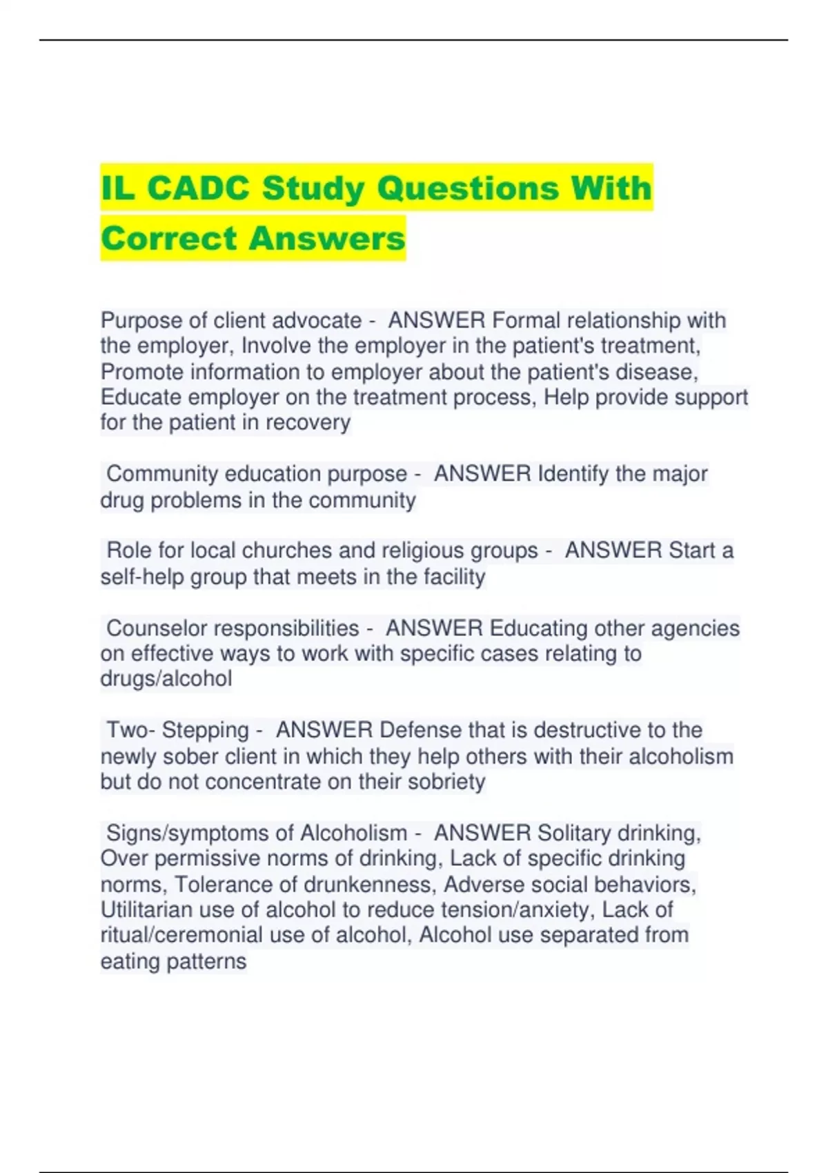IL CADC Study Questions With Correct Answers Purpose of client advocate - ANSWER Formal relationship with the employer, Involve the employer in the patient's treatment, Promote information to employer about the patient's disease, Educate employer on the treatment process, Help provide support for the patient in recovery Community education purpose - ANSWER Identify the major drug problems in the community Role for local churches and religious groups - ANSWER Start a self-help group that meets in the facility Counselor responsibilities - ANSWER Educating other agencies on effective ways to work with specific cases relating to drugs/alcohol Two- Stepping - ANSWER Defense that is destructive to the newly sober client in which they help others with their alcoholism but do not concentrate on their sobriety Signs/symptoms of Alcoholism - ANSWER Solitary drinking, Over permissive norms of drinking, Lack of specific drinking norms, Tolerance of drunkenness, Adverse social behaviors, Utilitarian use of alcohol to reduce tension/anxiety, Lack of ritual/ceremonial use of alcohol, Alcohol use separated from eating patterns Signs/symptoms of Alcoholism - ANSWER Alcohol use separated from family, social functions, Drinking with strangers, Alcohol not introduced in small amounts when a child, Drinking pursued as recreation, Drinking concentrated in young males, Culture that stresses individualism, self-reliance and high achievement Referring to AA/NA - ANSWER Have a AA/NA person meet w/them and explain how the group and recovery can work together, Not proper to refer an atheist since it is built on a belief in God, do not refer if it would seem to be disrespectful of clients rights and views, Make sure the referral meets the clients personality and background Dual Diagnosis - ANSWER Sometimes appear as patients sober up Referral processes - ANSWER Identifying the needs of the client that cannot be met by the counselor/agency and Assisting the client to utilize the support system and community resources available Discharge summary is needed - ANSWER Inpatient, aftercare, detox, half way houses, etc, Communications from one agency to another and increases accountability, Reports and record keeping tells the story of the client from beginning to end, No universally accepted format for maintaining records Reports - ANSWER Explains various aspects of the assessment, treatment plans, and discharge to parties who need such information to enhance the care of the client Documents patient can sign - ANSWER Consent for treatment, Public aid, DASA, statistics, Treatment plans, Release of information, To acquire medical attention, Education/prevention, Client education, Crisis intervention Patient has a right to - ANSWER Treatment costs they are liable for, When treatment services are available, Types of counseling approaches used, Opportunity to complain to appropriate staff Client files - ANSWER Only the clinical supervisor has unrestricted access to client's files Physiological dependence for alcohol- Alpha - ANSWER Psychological dependence, no loss of control, reliance on alcohol to weather problems Physiological dependence for alcohol- Beta - ANSWER Psychological dependence, physical problems (cirrhosis) but no physical dependence Physiological dependence
