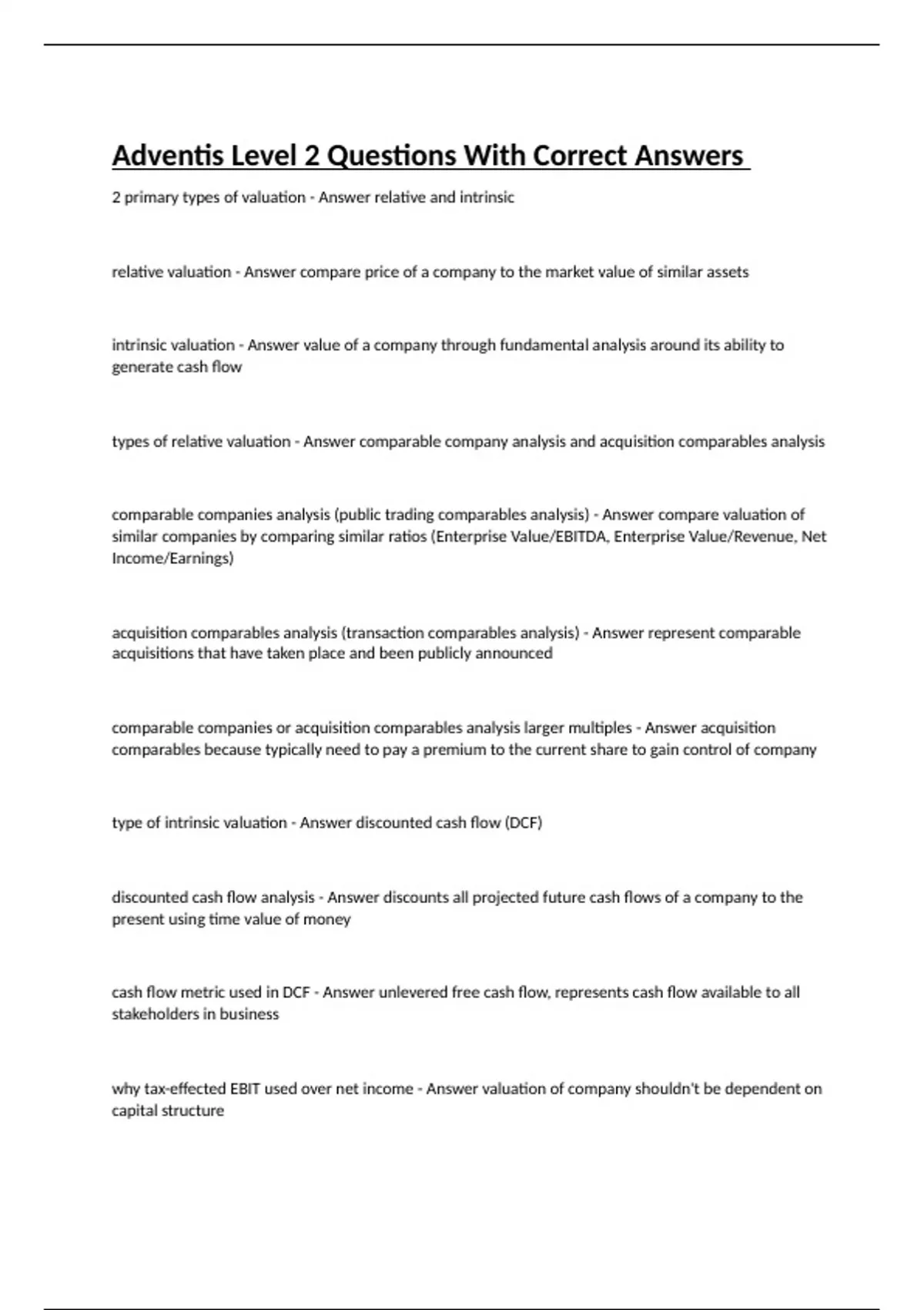 2 primary types of valuation - Answer relative and intrinsic relative valuation - Answer compare price of a company to the market value of similar assets intrinsic valuation - Answer value of a company through fundamental analysis around its ability to generate cash flow types of relative valuation - Answer comparable company analysis and acquisition comparables analysis comparable companies analysis (public trading comparables analysis) - Answer compare valuation of similar companies by comparing similar ratios (Enterprise Value/EBITDA, Enterprise Value/Revenue, Net Income/Earnings) acquisition comparables analysis (transaction comparables analysis) - Answer represent comparable acquisitions that have taken place and been publicly announced comparable companies or acquisition comparables analysis larger multiples - Answer acquisition comparables because typically need to pay a premium to the current share to gain control of company type of intrinsic valuation - Answer discounted cash flow (DCF) discounted cash flow analysis - Answer discounts all projected future cash flows of a company to the present using time value of money cash flow metric used in DCF - Answer unlevered free cash flow, represents cash flow available to all stakeholders in business why tax-effected EBIT used over net income - Answer valuation of company shouldn't be dependent on capital structure first component of determining present value of company - Answer calculate present value of each year's unlevered free cash flow, by discounting each year cash flow to present value using discount rate discount rate - Answer reflects cost of capital from the perspective of the stakeholder analyzing the company second component of determining PV of company - Answer calculate present value of all cash flow beyond projection period, terminal value methods of getting terminal value - Answer perpetuity method and EBITDA exit multiple method