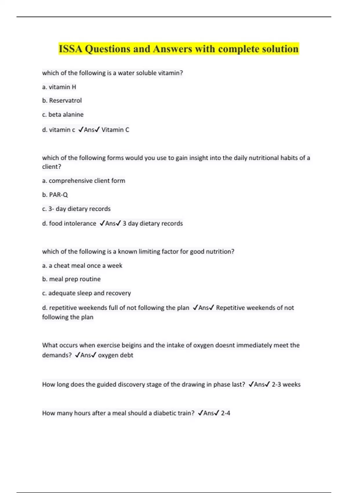 ISSA Questions and Answers with complete solution which of the following is a water soluble vitamin? a. vitamin H b. Reservatrol c. beta alanine d. vitamin c Ans Vitamin C which of the following forms would you use to gain insight into the daily nutritional habits of a client? a. comprehensive client form b. PAR-Q c. 3- day dietary records d. food intolerance Ans 3 day dietary records which of the following is a known limiting factor for good nutrition? a. a cheat meal once a week b. meal prep routine c. adequate sleep and recovery d. repetitive weekends full of not following the plan Ans Repetitive weekends of not following the plan What occurs when exercise beigins and the intake of oxygen doesnt immediately meet the demands? Ans oxygen debt How long does the guided discovery stage of the drawing in phase last? Ans 2-3 weeks How many hours after a meal should a diabetic train? Ans 2-4 which of the following is an example of polyunsaturated fatty acid? a. Omega 6 b. oleic acid c. amino acids d. Vitamin K Ans Omega 6 Which of the following stabilizes the knee on the posterior side? Sartorius gracilis hamstrings quadriceps Ans Hamstrings what amount should a female have of fats per meal? Ans 1 thumb what special population are emiromental considerations such a pollen, allergies, and extreame temperatures are key to their training plan? Ans asthmatics which of the following is acceptable body fat range for male? 6-9% 10-14% 15-18% 19-23% Ans 19-23 A weight loss client is currently exercising 5+ hours a week and hits a plateau. What adjustments should a trainer suggest? Increase k/cal by 250 Decrease k/cal by 100 Increase k/cal 100 Decrease k/cal by 250 Ans Decrease by 100 What exercise should be performed FIRST? Broad jump Back squat Split squat Power clean Ans po