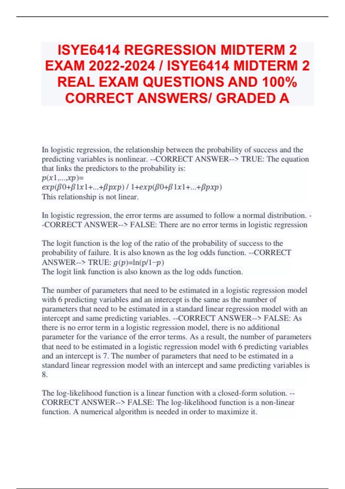 ISYE6414 REGRESSION MIDTERM 2 EXAM / ISYE6414 MIDTERM 2 REAL EXAM QUESTIONS AND 100% CORRECT ANSWERS/ GRADED A In logistic regression, the relationship between the probability of success and the predicting variables is nonlinear. --CORRECT ANSWER--> TRUE: The equation that links the predictors to the probability is: