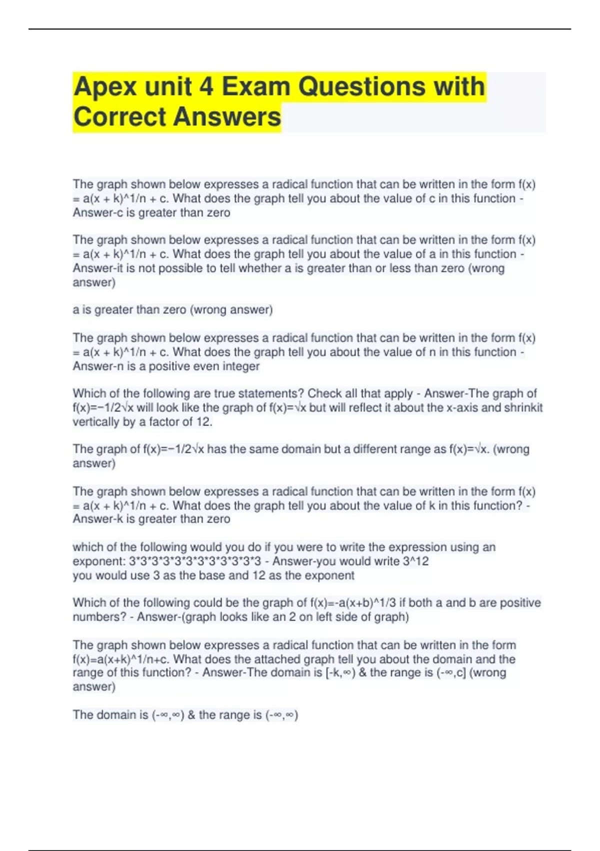 Apex unit 4 Exam Questions with Correct Answers The graph shown below expresses a radical function that can be written in the form f(x) = a(x + k)^1/n + c. What does the graph tell you about the value of c in this function - Answer-c is greater than zero The graph shown below expresses a radical function that can be written in the form f(x) = a(x + k)^1/n + c. What does the graph tell you about the value of a in this function - Answer-it is not possible to tell whether a is greater than or less than zero (wrong answer) a is greater than zero (wrong answer) The graph shown below expresses a radical function that can be written in the form f(x) = a(x + k)^1/n + c. What does the graph tell you about the value of n in this function - Answer-n is a positive even integer Which of the following are true statements? Check all that apply - Answer-The graph of f(x)=−1/2√x will look like the graph of f(x)=√x but will reflect it about the x-axis and shrink it vertically by a factor of 12. The graph of f(x)=−1/2√x has the same domain but a different range as f(x)=√x. (wrong answer) The graph shown below expresses a radical function that can be written in the form f(x) = a(x + k)^1/n + c. What does the graph tell you about the value of k in this function? - Answer-k is greater than zero