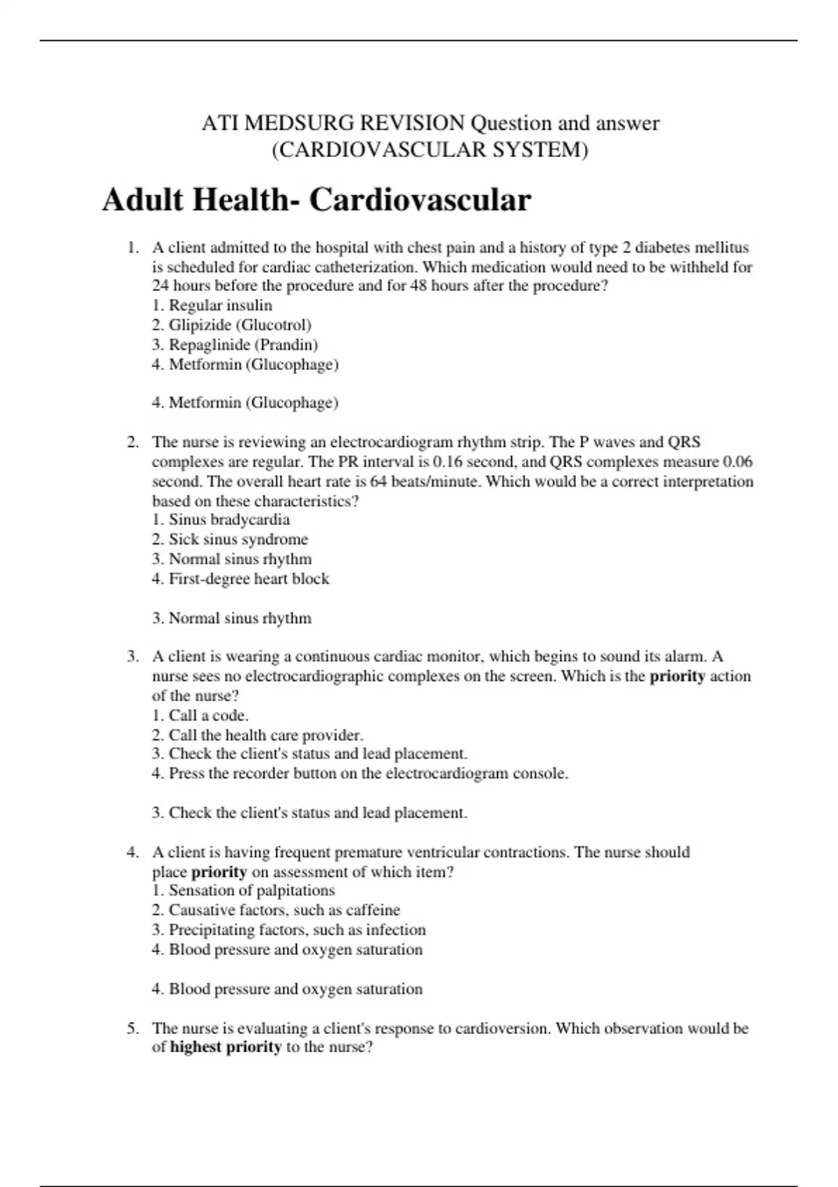 1. A client admitted to the hospital with chest pain and a history of type 2 diabetes mellitus is scheduled for cardiac catheterization. Which medication would need to be withheld for 24 hours before the procedure and for 48 hours after the procedure? 1. Regular insulin 2. Glipizide (Glucotrol) 3. Repaglinide (Prandin) 4. Metformin (Glucophage) 4. Metformin (Glucophage) 2. The nurse is reviewing an electrocardiogram rhythm strip. The P waves and QRS complexes are regular. The PR interval is 0.16 second, and QRS complexes measure 0.06 second. The overall heart rate is 64 beats/minute. Which would be a correct interpretation based on these characteristics? 1. Sinus bradycardia 2. Sick sinus syndrome 3. Normal sinus rhythm 4. First-degree heart block 3. Normal sinus rhythm 3. A client is wearing a continuous cardiac monitor, which begins to sound its alarm. A nurse sees no electrocardiographic complexes on the screen. Which is the priority action of the nurse? 1. Call a code. 2. Call the health care provider. 3. Check the client's status and lead placement. 4. Press the recorder button on the electrocardiogram console. 3. Check the client's status and lead placement. 4. A client is having frequent premature ventricular contractions. The nurse should place priority on assessment of which item? 1. Sensation of palpitations 2. Causative factors, such as caffeine 3. Precipitating factors, such as infection 4. Blood pressure and oxygen saturation 4. Blood pressure and oxygen saturation 5. The nurse is evaluating a client's response to cardioversion. Which observation would be of highest priority to the nurse? 1. Blood pressure 2. Status of airway 3. Oxygen flow rate 4. Level of consciousness 2. Status of airway 6. The nurse is caring for a client who has just had implantation of an automatic internal cardioverter-defibrillator. The nurse immediately would assess which item base