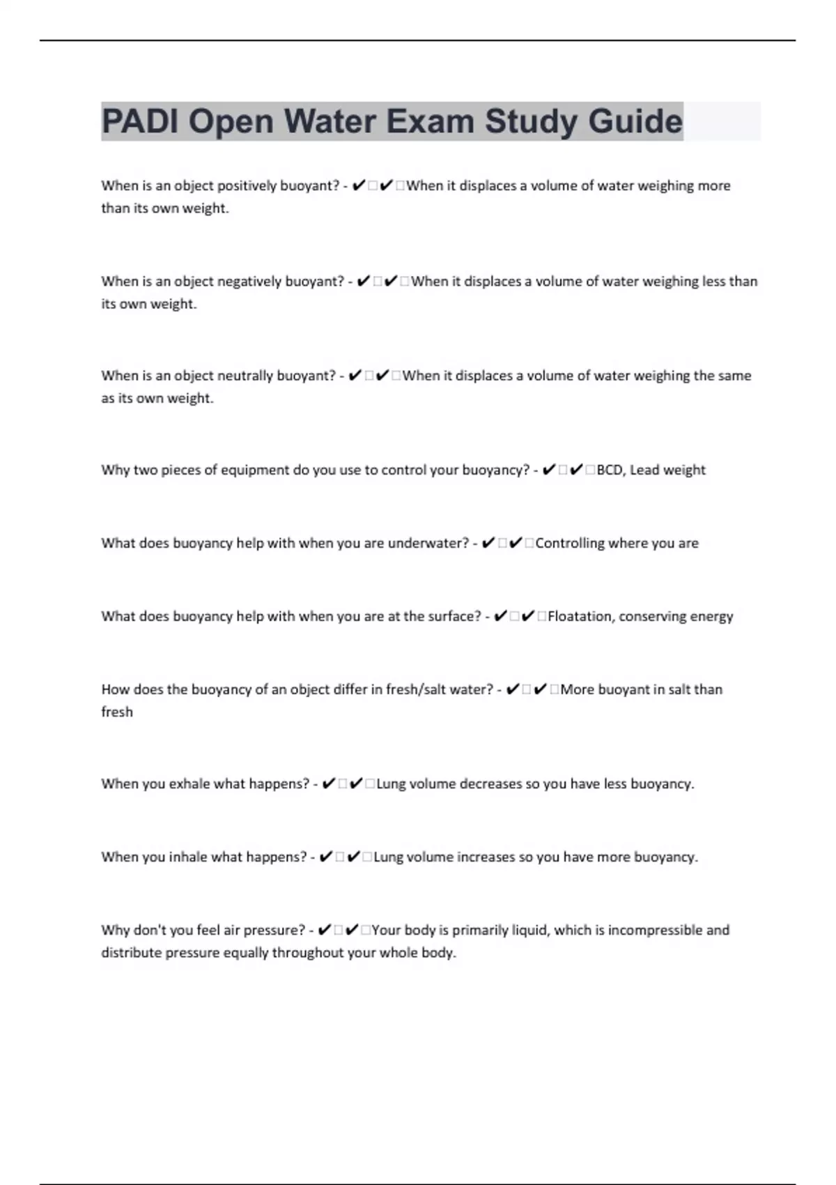 When is an object positively buoyant? - ️️When it displaces a volume of water weighing more than its own weight. When is an object negatively buoyant? - ️️When it displaces a volume of water weighing less than its own weight. When is an object neutrally buoyant? - ️️When it displaces a volume of water weighing the same as its own weight. Why two pieces of equipment do you use to control your buoyancy? - ️️BCD, Lead weight What does buoyancy help with when you are underwater? - ️️Controlling where you are What does buoyancy help with when you are at the surface? - ️️Floatation, conserving energy How does the buoyancy of an object differ in fresh/salt water? - ️️More buoyant in salt than fresh When you exhale what happens? - ️️Lung volume decreases so you have less buoyancy. When you inhale what happens? - ️️Lung volume increases so you have more buoyancy. Why don't you feel air pressure? - ️️Your body is primarily liquid, which is incompressible and distribute pressure equally throughout your whole body.