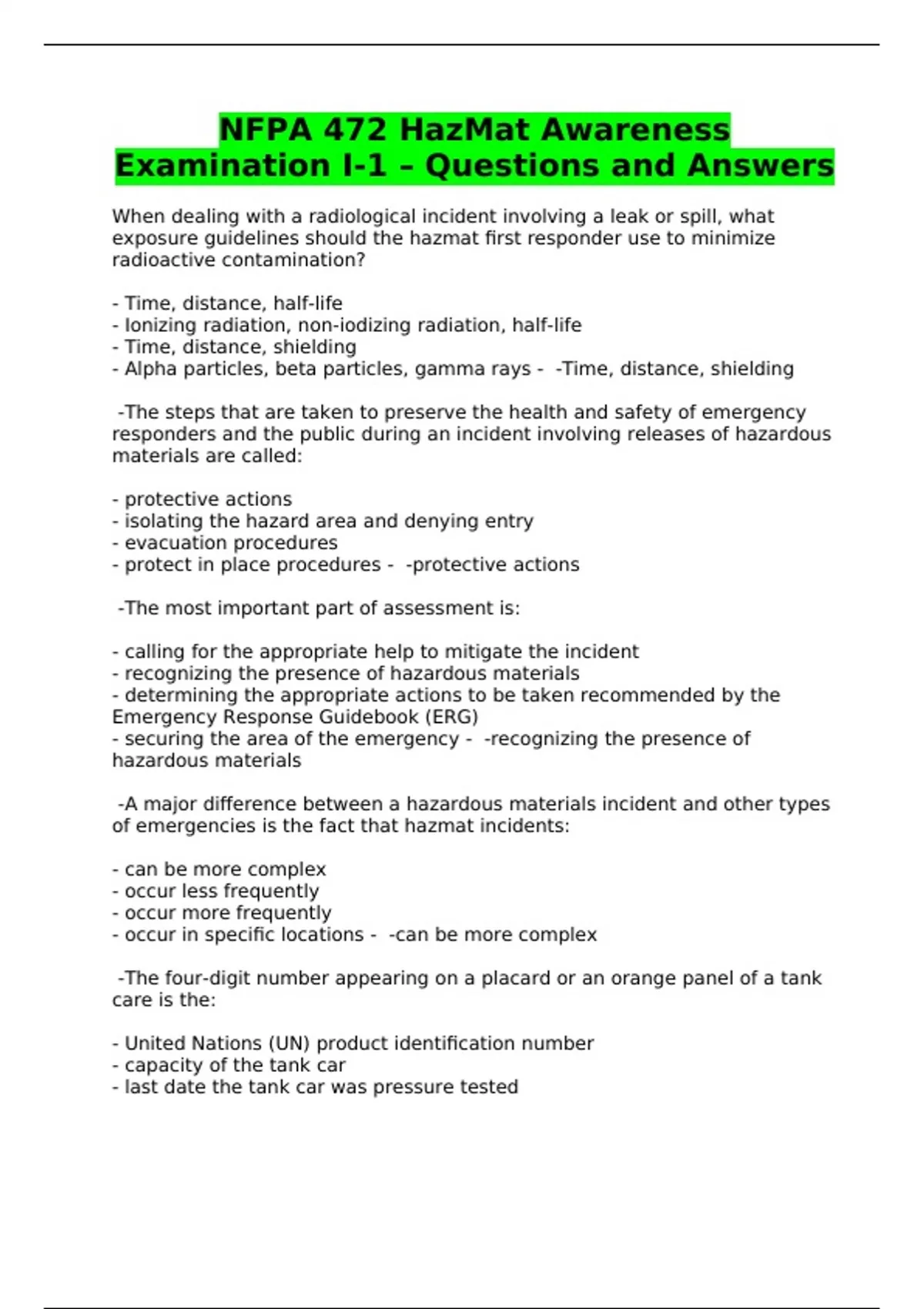 NFPA 472 HazMat Awareness Examination I-1 – Questions and Answers