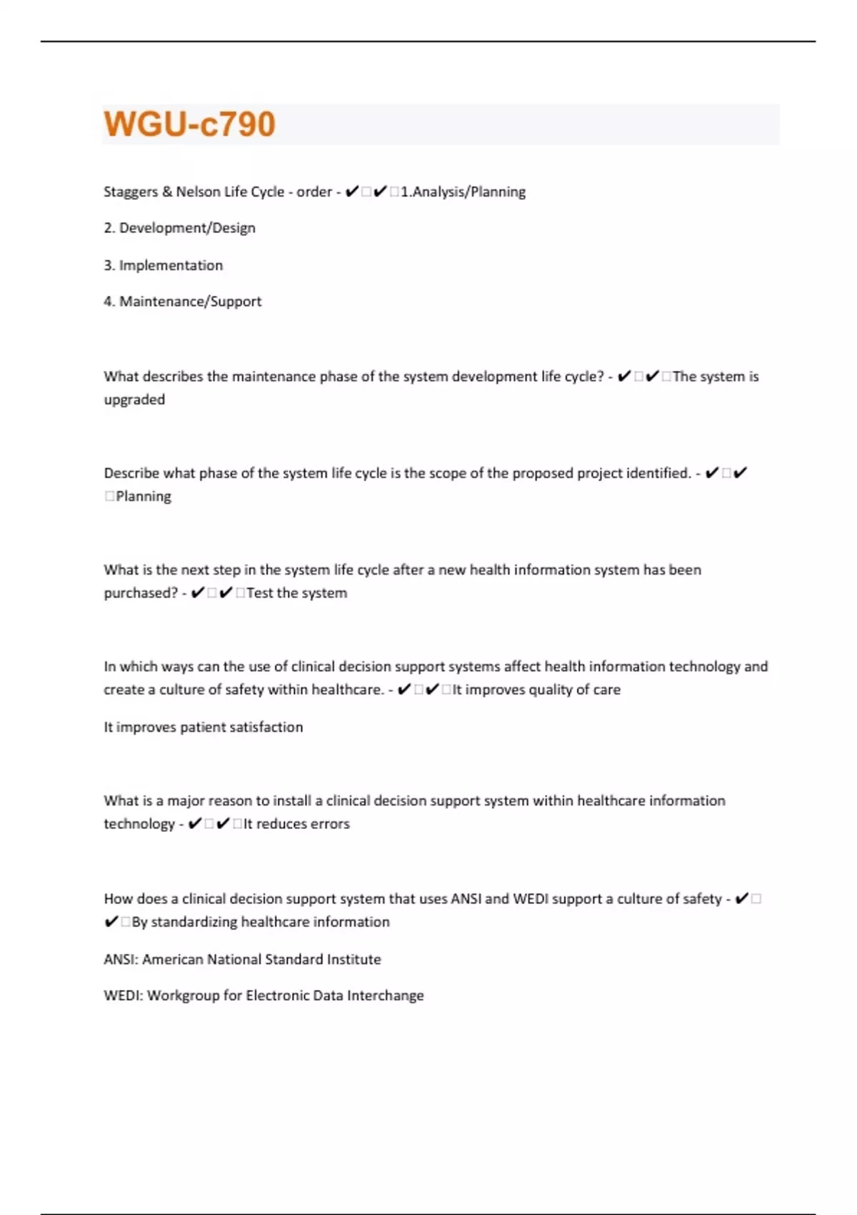 Staggers & Nelson Life Cycle - order - ️️1.Analysis/Planning 2. Development/Design 3. Implementation 4. Maintenance/Support What describes the maintenance phase of the system development life cycle? - ️️The system is upgraded Describe what phase of the system life cycle is the scope of the proposed project identified. - ️️Planning What is the next step in the system life cycle after a new health information system has been purchased? - ️️Test the system In which ways can the use of clinical decision support systems affect health information technology and create a culture of safety within healthcare. - ️️It improves quality of care It improves patient satisfaction What is a major reason to install a clinical decision support system within healthcare information technology - ️️It reduces errors How does a clinical decision support system that uses ANSI and WEDI support a culture of safety - ️️By standardizing healthcare information ANSI: American National Standard Institute WEDI: Workgroup for Electronic Data Interchange