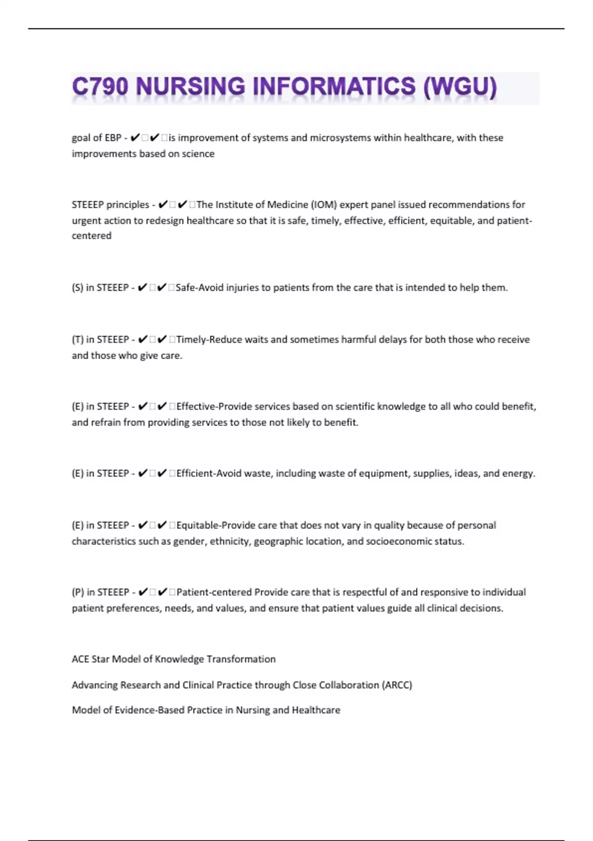 goal of EBP - ️️is improvement of systems and microsystems within healthcare, with these improvements based on science STEEEP principles - ️️The Institute of Medicine (IOM) expert panel issued recommendations for urgent action to redesign healthcare so that it is safe, timely, effective, efficient, equitable, and patient-centered (S) in STEEEP - ️️Safe-Avoid injuries to patients from the care that is intended to help them. (T) in STEEEP - ️️Timely-Reduce waits and sometimes harmful delays for both those who receive and those who give care. (E) in STEEEP - ️️Effective-Provide services based on scientific knowledge to all who could benefit, and refrain from providing services to those not likely to benefit. (E) in STEEEP - ️️Efficient-Avoid waste, including waste of equipment, supplies, ideas, and energy. (E) in STEEEP - ️️Equitable-Provide care that does not vary in quality because of personal characteristics such as gender, ethnicity, geographic location, and socioeconomic status. (P) in STEEEP - ️️Patient-centered Provide care that is respectful of and responsive to individual patient preferences, needs, and values, and ensure that patient values guide all clinical decisions. ACE Star Model of Knowledge Transformation Advancing Research and Clinical Practice through Close Collaboration (ARCC) Model of Evidence-Based Practice in Nursing and Healthcare