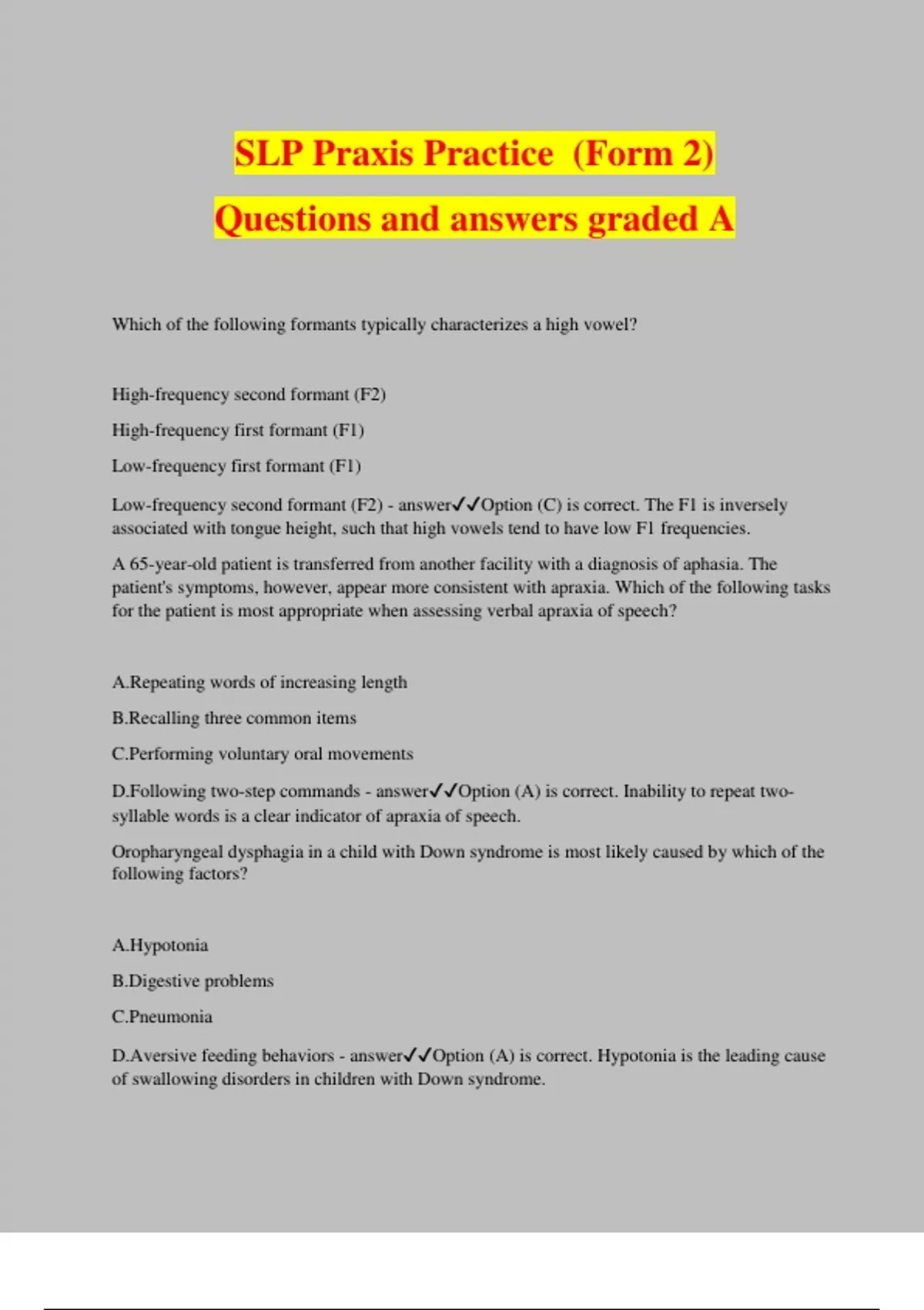 SLP Praxis Practice (Form 2) Questions and answers graded A Which of the following formants typically characterizes a high vowel? High-frequency second formant (F2) High-frequency first formant (F1) Low-frequency first formant (F1) Low-frequency second formant (F2) - answerOption (C) is correct. The F1 is inversely associated with tongue height, such that high vowels tend to have low F1 frequencies. A 65-year-old patient is transferred from another facility with a diagnosis of aphasia. The patient's symptoms, however, appear more consistent with apraxia. Which of the following tasks for the patient is most appropriate when assessing verbal apraxia of speech? A.Repeating words of increasing length B.Recalling three common items C.Performing voluntary oral movements D.Following two-step commands - answerOption (A) is correct. Inability to repeat two- syllable words is a clear indicator of apraxia of speech. Oropharyngeal dysphagia in a child with Down syndrome is most likely caused by which of the following factors? A.Hypotonia B.Digestive problems C.Pneumonia D.Aversive feeding behaviors - answerOption (A) is correct. Hypotonia is the leading cause of swallowing disorders in children with Down syndrome. Which of the following recommendations to a parent of an infant with cleft lip and palate should an SLP make to best optimize feeding for adequate nutrition and appropriate growth? A.Providing a bottle rather than breast-feeding the infant B.Positioning the infant in a supine position during feeding times C.Allowing the infant to take as much time as needed to feed D.Using a bottle with a modified nipple during feedings - answerOption (D) is correct. A bottle with a modified nipple allows for greater control over the quantity of liquid expressed and the pacing of feeding. The head lift exercise published by Shaker et al. (2002) was designed to produce which of the following changes in swallow biomechanics? A.Increase in laryngeal closure duration B.Strengthening of the base of the tongue C.Increase in diameter and duration of the upper esophageal sphincter (UESU E S) opening D.Prolonged relaxation of the cricopharyngeal portion of the inferior constrictor muscle - answerOption (C) is correct. The results of Shaker et al. (2002) demonstrated a significant (p<.01p left angle bracket period zero one) increase in the opening duration of the UESU E S. Which of the following sounds are typically mastered by the time a child turns 3? A./k/ and /g/forward slash k forward slash and forward slash g forward slash B./p/ and /b/forward slash p forward slash and forward slash b forward slash C./l/ and /s/forward slash l forward slash and forward slash s forward slash D./ch/ and /sh/ - answerOption (B) is correct. /p/ and /b/forward slash p forward slash and forward slash b forward slash should be mastered by age 3 in a typically developing child. When assessing the ability of a student with cerebral palsy to access an augmentative and alternative communication device, which of the following physical factors must be evaluated first? A.Upper extremity range of motion B.Lower extremity strength C.Trunk stability and control D.Fine motor dexterity - answerOption (C) is correct. Trunk stability will guide the clinician in making an appropriate recommendation for the type of device a client can access as it influences more distal movements. A school-based SLP wants to discharge a fifth-grade student. The student has mastered all his goals except /r/forward slash r forward slash in conversational speech. The SLP worked with the student for the entire school year, and the student is able to use /r/forward slash r forward slash accurately 75 percent of the time. However, the goal is to reach 90 percent accuracy. Because the student worked on the skill all year and still has not met the established goal, the SLP feels the student performs at his highest possible level. The SLP does not think it is in the student's best interest to continue pulling the student out of class to address the goal. The parents are upset and are questioning the SLP's decision. Which of the following statements from the American Speech-Language-Hearing Association (ASHA) Code of Ethics can be used to back up the SLP's decision? A.Individuals who hold the Certificate of Clinical C - answerOption (A) is correct. According to ASHA, it is important that SLPs remember to provide services when a benefit can be expected. The SLP has exhausted all treatment options and a benefit for this student is no longer expected. Put in order of acquision: p, k, dj, th - answer/p/forward slash p forward is first because this phoneme is developed between ages 1 and 3. /k/forward slash k forward slash is second because this is developed by age 3 1/2. /θ/forward slash omega forward slash is third because this is developed between ages 3 and 8. /ʒ/forward slash ezh forward slash is last because this is developed between ages 6 and 8. ((P, K, TH, J)) An 81-year-old female presents to a rehabilitation hospital following a severe L MCA stroke. The patient has poststroke right-side