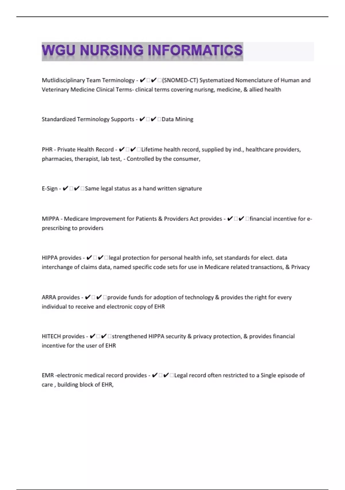 Mutlidisciplinary Team Terminology - ️️(SNOMED-CT) Systematized Nomenclature of Human and Veterinary Medicine Clinical Terms- clinical terms covering nurisng, medicine, & allied health Standardized Terminology Supports - ️️Data Mining PHR - Private Health Record - ️️Lifetime health record, supplied by ind., healthcare providers, pharmacies, therapist, lab test, - Controlled by the consumer, E-Sign - ️️Same legal status as a hand written signature MIPPA - Medicare Improvement for Patients & Providers Act provides - ️️financial incentive for e-prescribing to providers HIPPA provides - ️️legal protection for personal health info, set standards for elect. data interchange of claims data, named specific code sets for use in Medicare related transactions, & Privacy ARRA provides - ️️provide funds for adoption of technology & provides the right for every individual to receive and electronic copy of EHR HITECH provides - ️️strengthened HIPPA security & privacy protection, & provides financial incentive for the user of EHR EMR -electronic medical record provides - ️️Legal record often restricted to a Single episode of care , building block of EHR,