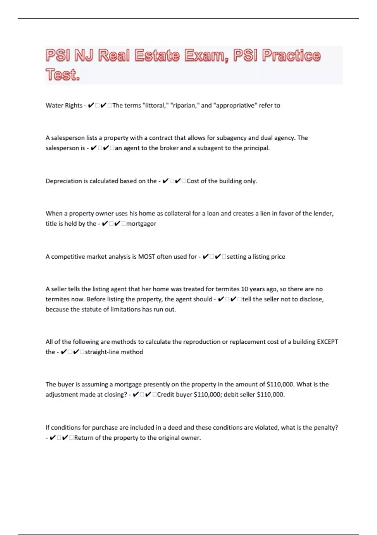 Water Rights - ️️The terms "littoral," "riparian," and "appropriative" refer to A salesperson lists a property with a contract that allows for subagency and dual agency. The salesperson is - ️️an agent to the broker and a subagent to the principal. Depreciation is calculated based on the - ️️Cost of the building only. When a property owner uses his home as collateral for a loan and creates a lien in favor of the lender, title is held by the - ️️mortgagor A competitive market analysis is MOST often used for - ️️setting a listing price A seller tells the listing agent that her home was treated for termites 10 years ago, so there are no termites now. Before listing the property, the agent should - ️️tell the seller not to disclose, because the statute of limitations has run out. All of the following are methods to calculate the reproduction or replacement cost of a building EXCEPT the - ️️straight-line method The buyer is assuming a mortgage presently on the property in the amount of $110,000. What is the adjustment made at closing? - ️️Credit buyer $110,000; debit seller $110,000. If conditions for purchase are included in a deed and these conditions are violated, what is the penalty? - ️️Return of the property to the original owner.