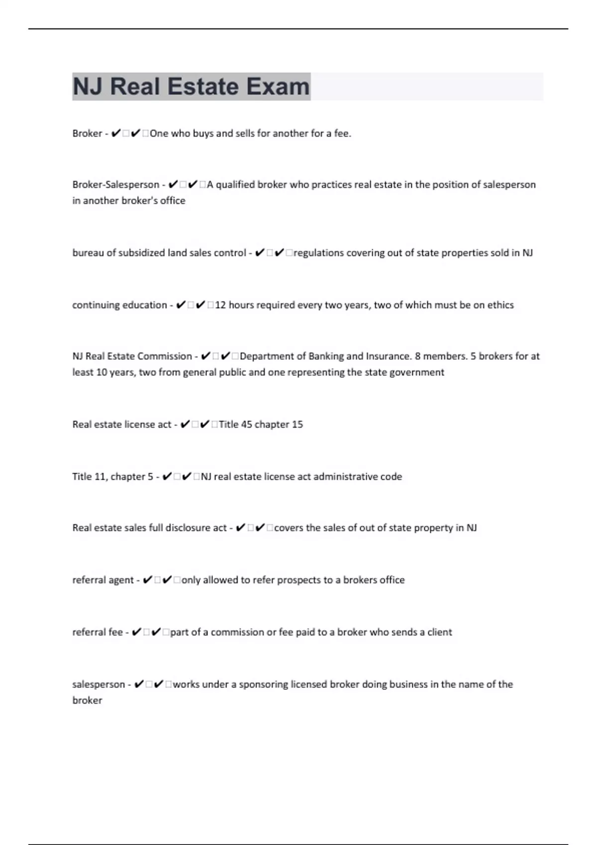 Broker - ️️One who buys and sells for another for a fee. Broker-Salesperson - ️️A qualified broker who practices real estate in the position of salesperson in another broker's office bureau of subsidized land sales control - ️️regulations covering out of state properties sold in NJ continuing education - ️️12 hours required every two years, two of which must be on ethics NJ Real Estate Commission - ️️Department of Banking and Insurance. 8 members. 5 brokers for at least 10 years, two from general public and one representing the state government Real estate license act - ️️Title 45 chapter 15 Title 11, chapter 5 - ️️NJ real estate license act administrative code Real estate sales full disclosure act - ️️covers the sales of out of state property in NJ referral agent - ️️only allowed to refer prospects to a brokers office referral fee - ️️part of a commission or fee paid to a broker who sends a client salesperson - ️️works under a sponsoring licensed broker doing business in the name of the broker