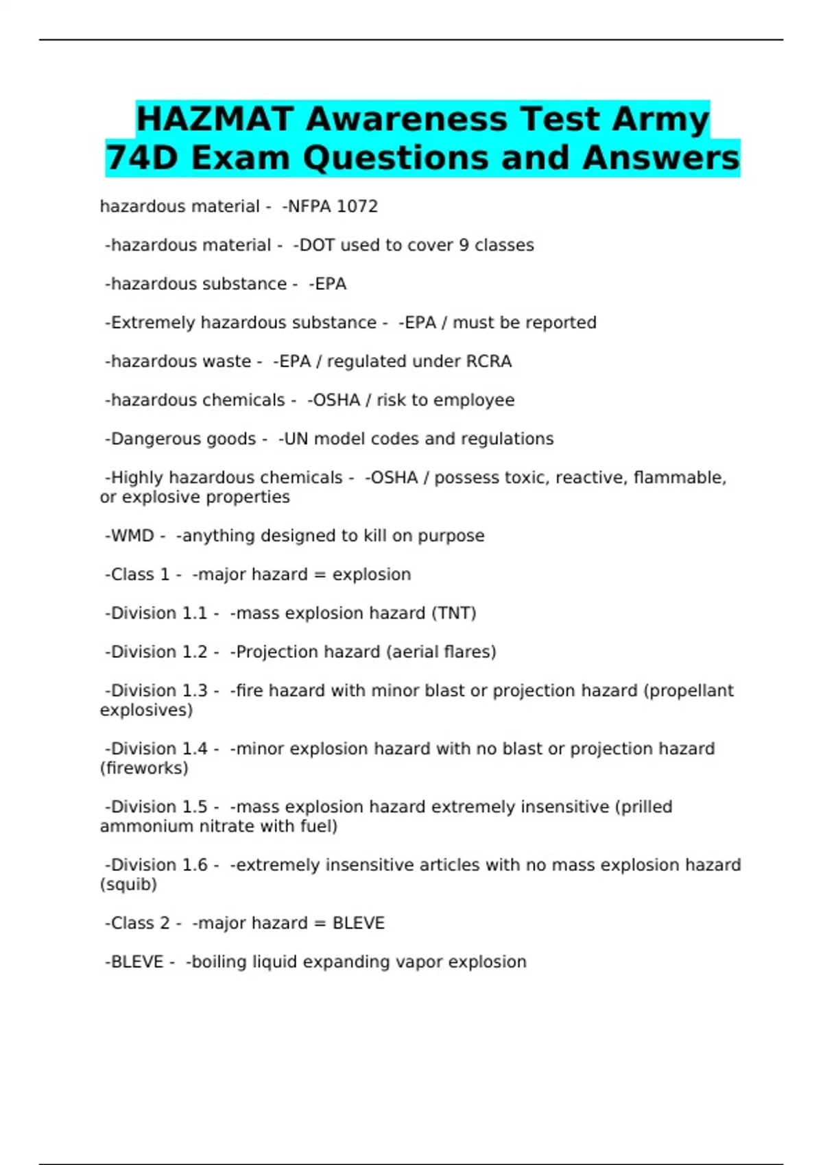HAZMAT Awareness Test Army 74D Exam Questions and Answers