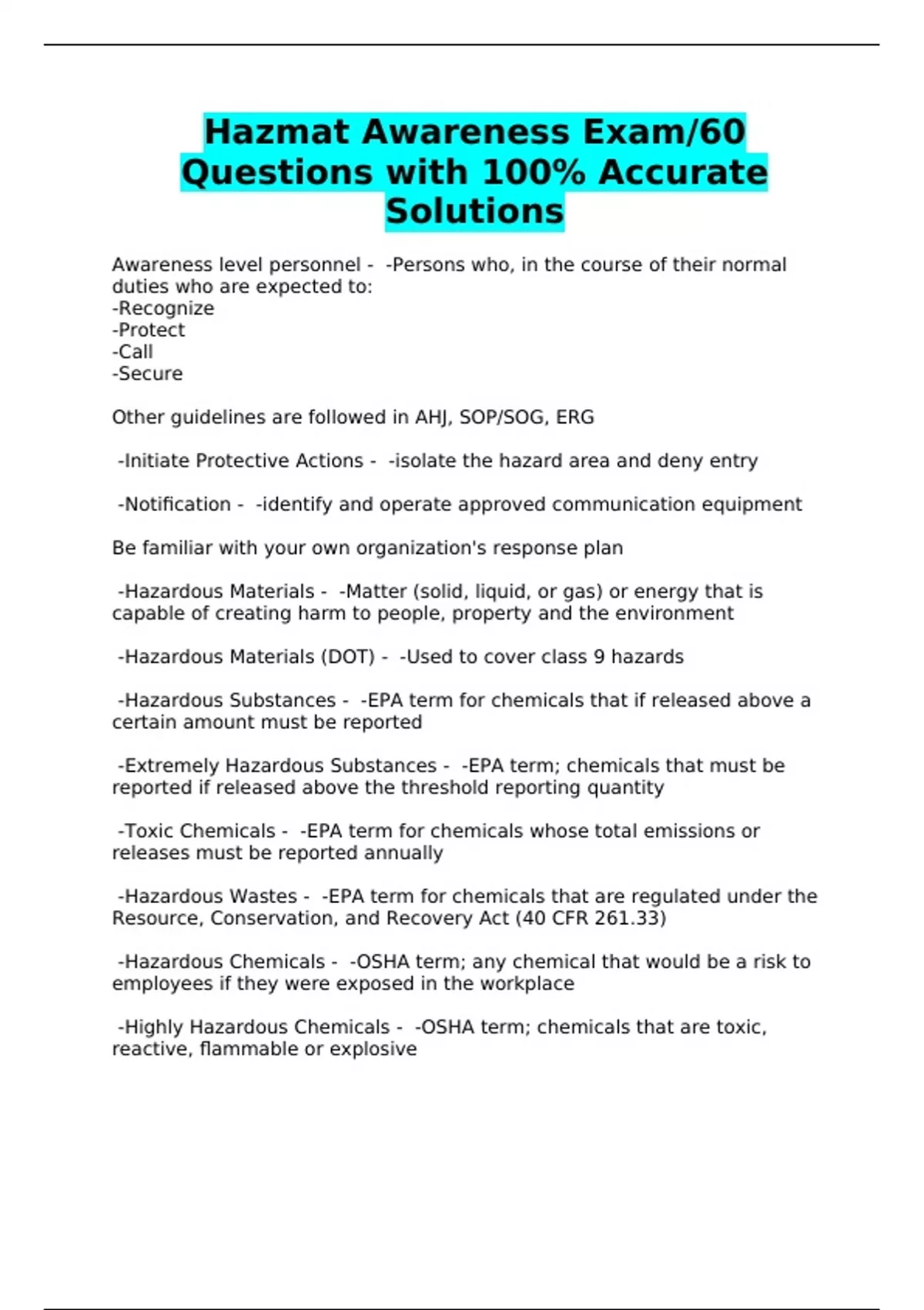 Hazmat Awareness Exam/60 Questions with 100% Accurate Solutions