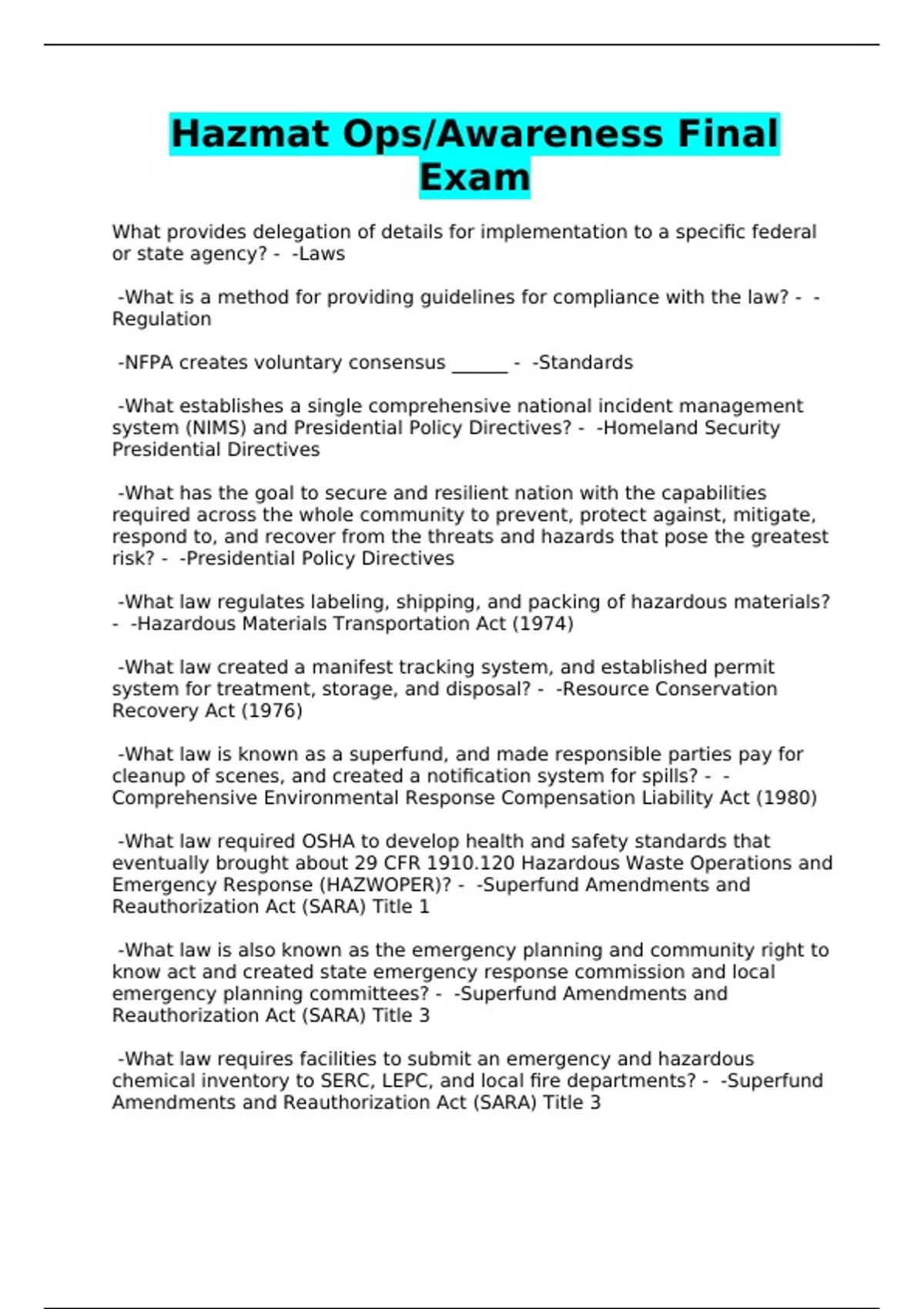 Hazmat Ops/Awareness Final Exam