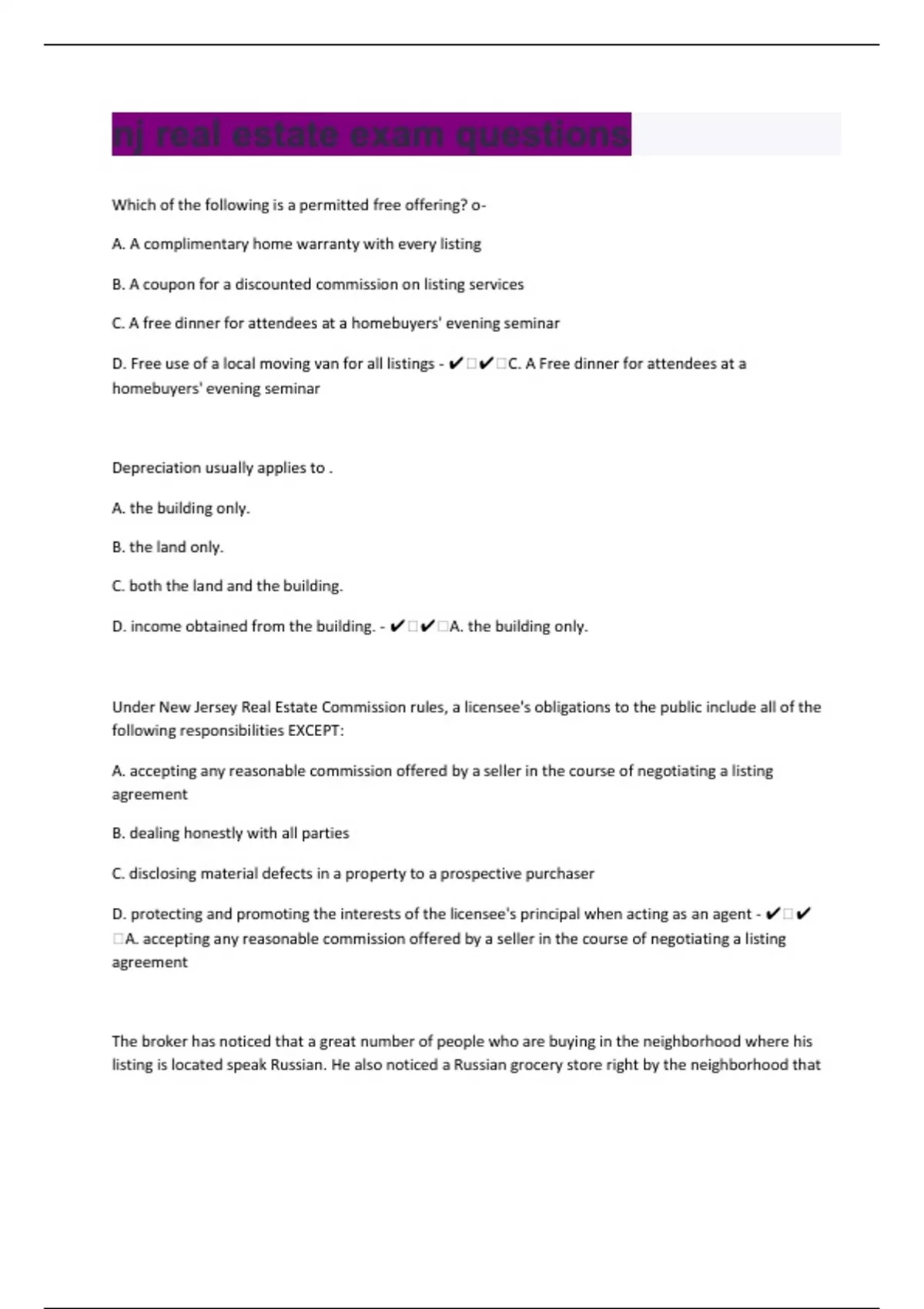 Which of the following is a permitted free offering? o- A. A complimentary home warranty with every listing B. A coupon for a discounted commission on listing services C. A free dinner for attendees at a homebuyers' evening seminar D. Free use of a local moving van for all listings - ️️C. A Free dinner for attendees at a homebuyers' evening seminar Depreciation usually applies to . A. the building only. B. the land only. C. both the land and the building. D. income obtained from the building. - ️️A. the building only. Under New Jersey Real Estate Commission rules, a licensee's obligations to the public include all of the following responsibilities EXCEPT: A. accepting any reasonable commission offered by a seller in the course of negotiating a listing agreement B. dealing honestly with all parties C. disclosing material defects in a property to a prospective purchaser D. protecting and promoting the interests of the licensee's principal when acting as an agent - ️️A. accepting any reasonable commission offered by a seller in the course of negotiating a listing agreement