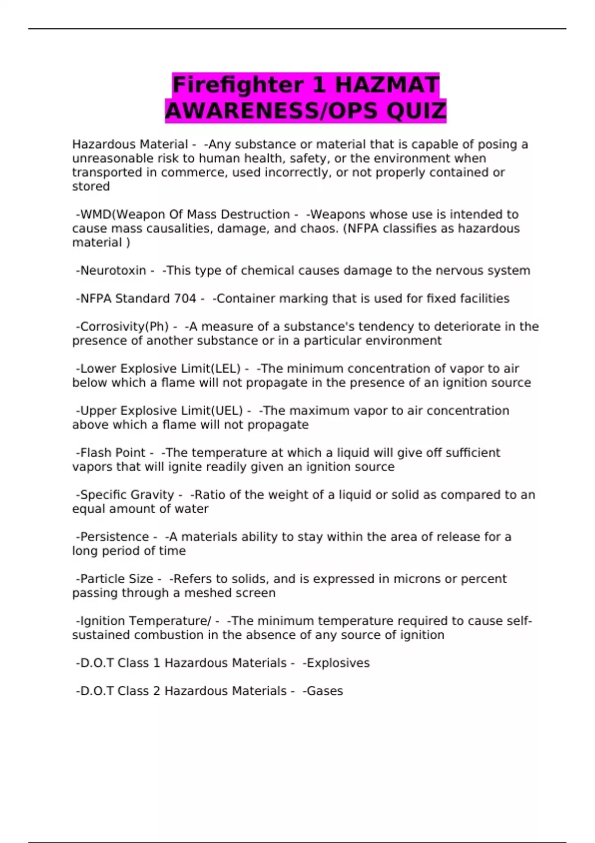Firefighter 1 HAZMAT AWARENESS/OPS QUIZ