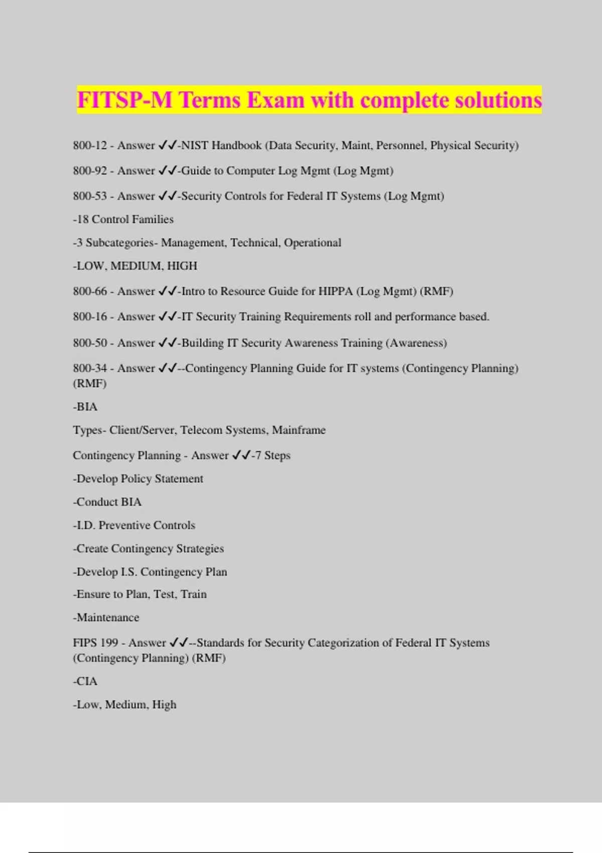 FITSP-M Terms Exam with complete solutions 800-12 - Answer ️️ -NIST Handbook (Data Security, Maint, Personnel, Physical Security) 800-92 - Answer ️️ -Guide to Computer Log Mgmt (Log Mgmt) 800-53 - Answer ️️ -Security Controls for Federal IT Systems (Log Mgmt) -18 Control Families -3 Subcategories- Management, Technical, Operational -LOW, MEDIUM, HIGH 800-66 - Answer ️️ -Intro to Resource Guide for HIPPA (Log Mgmt) (RMF) 800-16 - Answer ️️ -IT Security Training Requirements roll and performance based. 800-50 - Answer ️️ -Building IT Security Awareness Training (Awareness) 800-34 - Answer ️️ --Contingency Planning Guide for IT systems (Contingency Planning) (RMF) -BIA Types- Client/Server, Telecom Systems, Mainframe Contingency Planning - Answer ️️ -7 Steps -Develop Policy Statement -Conduct BIA -I.D. Preventive Controls -Create Contingency Strategies -Develop I.S. Contingency Plan -Ensure to Plan, Test, Train -Maintenance FIPS 199 - Answer ️️ --Standards for Security Categorization of Federal IT Systems (Contingency Planning) (RMF) -CIA -Low, Medium, High