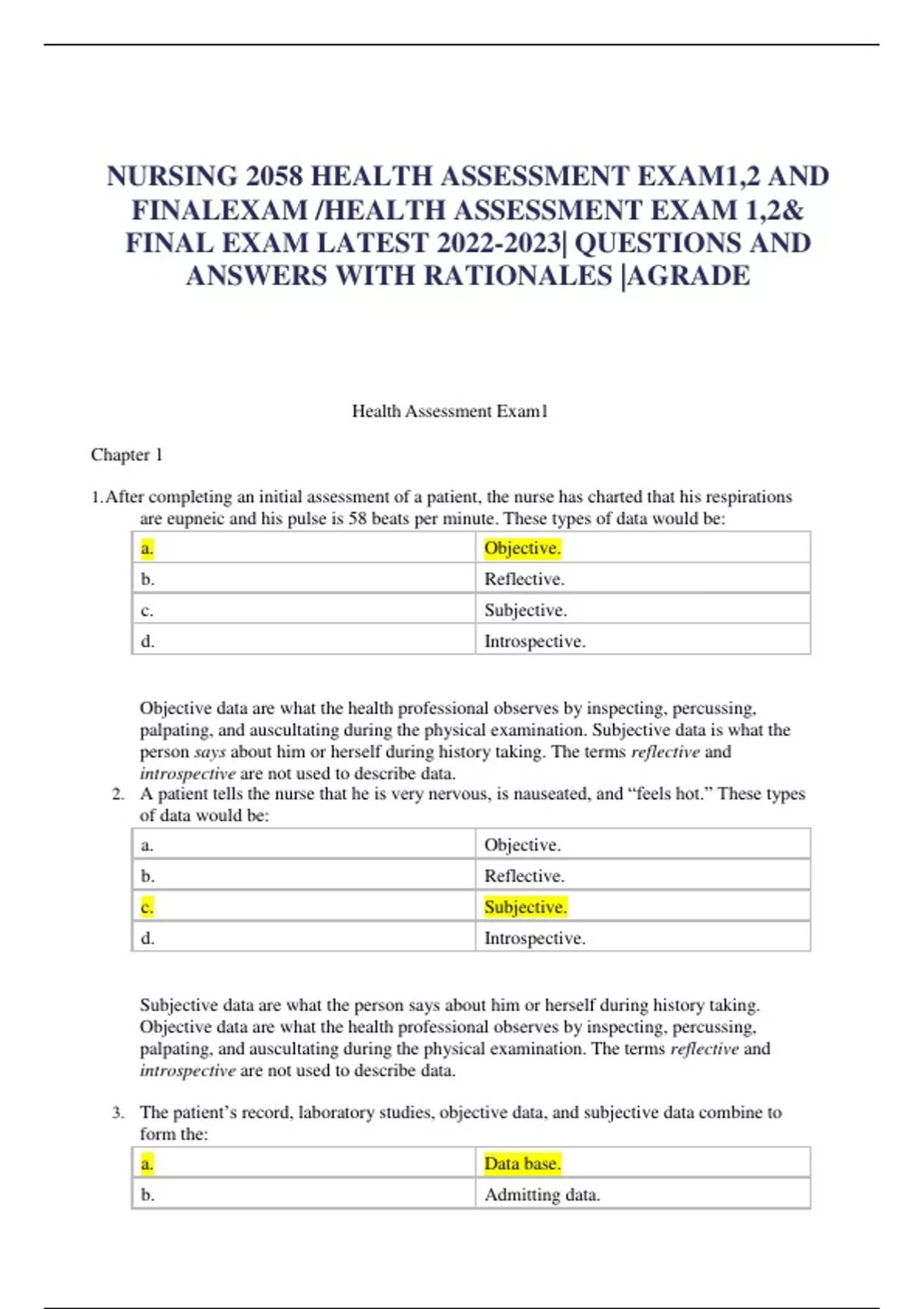 NURSING 2058 HEALTH ASSESSMENT EXAM1,2 AND FINALEXAM /HEALTH ASSESSMENT EXAM 1,2& FINAL EXAM LATEST | QUESTIONS AND ANSWERS WITH RATIONALES |AGRADE Health Assessment Exam1 Chapter 1 1.After completing an initial assessment of a patient, the nurse has charted that his respirations are eupneic and his pulse is 58 beats per minute. These types of data would be: a. Objective. b. Reflective. c. Subjective. d. Introspective. Objective data are what the health professional observes by inspecting, percussing, palpating, and auscultating during the physical examination. Subjective data is what the person says about him or herself during history taking. The terms reflective and introspective are not used to describe data. 2. A patient tells the nurse that he is very nervous, is nauseated, and “feels hot.” These types of data would be: a. Objective. b. Reflective. c. Subjective. d. Introspective. Subjective data are what the person says about him or herself during history taking. Objective data are what the health professional observes by inspecting, percussing, palpating, and auscultating during the physical examination. The terms reflective and introspective are not used to describe data. 3. The patient’s record, laboratory studies, objective data, and subjective data combine to form the: a. Data base. b. Admitting data. c. Financial statement. d. Discharge summary. Together with the patient’s record and laboratory studies, the objective and subjective data form the data base. The other items are not part of the patient’s record, laboratory studies, or data. 4. When listening to a patient’s breath sounds, the nurse is unsure of a sound that is heard. The nurse’s next action should be to: a. Immediately notify the patient’s physician. b. Document the sound exactly as it was heard. c. Validate the data by asking a coworker to listen to the breath sounds. d. Assess again in 20 minutes to note whether the sound is still present. When unsure of a sound heard while listening to a patient’s breath sounds, the nurse validates the data to ensure accuracy. If the nurse has less experience in an area, then he or she asks an expert to listen. 5. The nurse is conducting a class for new graduate nurses. During the teaching session, the nurse should keep in mind that novice nurses, without a background of skills and experience from which to draw, are more likely to make their decisions using: a. Intuition. b. A set of rules. c. Articles in journals. d. Advice from supervisors. Novice nurses operate from a set of defined, structured rules. The expert practitioner uses intuitive links. 6. Expert nurses learn to attend to a pattern of assessment data and act without consciously labeling it. These responses are referred to as: a. Intuition. b. The nursing process. c. Clinical knowledge. d. Diagnostic reasoning. Intuition is characterized by pattern recognition—expert nurses learn to attend to a pattern of assessment data and act without consciously labeling it. The other options are not correct. 7. The nurse is reviewing information about evidence-based practice (EBP). Which statement best reflects EBP? a. EBP relies on tradition for support of best practices. b. EBP is simply the use of best practice techniques for the treatment of patients. c. EBP emphasizes the use of best evidence with the clinician’s experience. d. The patient’s own preferences are not important with EBP. EBP is a systematic approach to practice that emphasizes the use of best evidence in combination with the clinician’s experience, as well as patient preferences and values, when making decisions about care and treatment. EBP is more than simply using the best practice techniques to treat patients, and questioning tradition is important when no compelling and supportive research evidence exists. 8. The nurse is conducting a class on priority setting for a group of new graduate nurses. Which is an example of a first-level priority problem? a. Patient with postoperative pain b. Newly diagnosed patient with diabetes who needs diabetic teaching c. Individual with a small laceration on the sole of the foot d. Individual with shortness of breath and respiratory distress First-level priority problems are those that are emergent, life threatening, and immediate (e.g., establishing an airway, supporting breathing, maintaining circulation, monitoring abnormal vital signs) (see Table 1-1). 9. When considering priority setting of problems, the nurse keeps in mind that second-level priority problems include which of these aspects? a. Low self-esteem b. Lack of knowledge c. Abnormal laboratory values d. Severely abnormal vital signs Second-level priority problems are those that require prompt intervention to forestall further deterioration (e.g., mental status change, acute pain, abnormal laboratory values, risks to safety or security) (see Table 1-1). 10. Which critical thinking skill helps the nurse see relationships among the data? a. Validation b. Clustering related cues c. Identifying gaps in data d. Distinguishing relevant from irrelevant Clustering related cues helps the nurse see relationships among the data. 11. The nurse knows that developing appropriate nursing interventions for a patient relies on the appropriateness of the diagnosis. a. Nursing b. Medical c. Admission d. Collaborative An accurate nursing diagnosis provides the basis for the selection of nursing interventions to achieve outcomes for which the nurse is accountable. The other items do not contribute to the development of appropriate nursing interventions. 12. The nursing process is a sequential method of problem solving that nurses use and includes which steps? a. Assessment, treatment, planning, evaluation, discharge, and follow-up b. Admission, assessment, diagnosis, treatment, and discharge planning c. Admission, diagnosis, treatment, evaluation, and discharge planning d. Assessment, diagnosis, outcome identification, planning, implementation, and eval