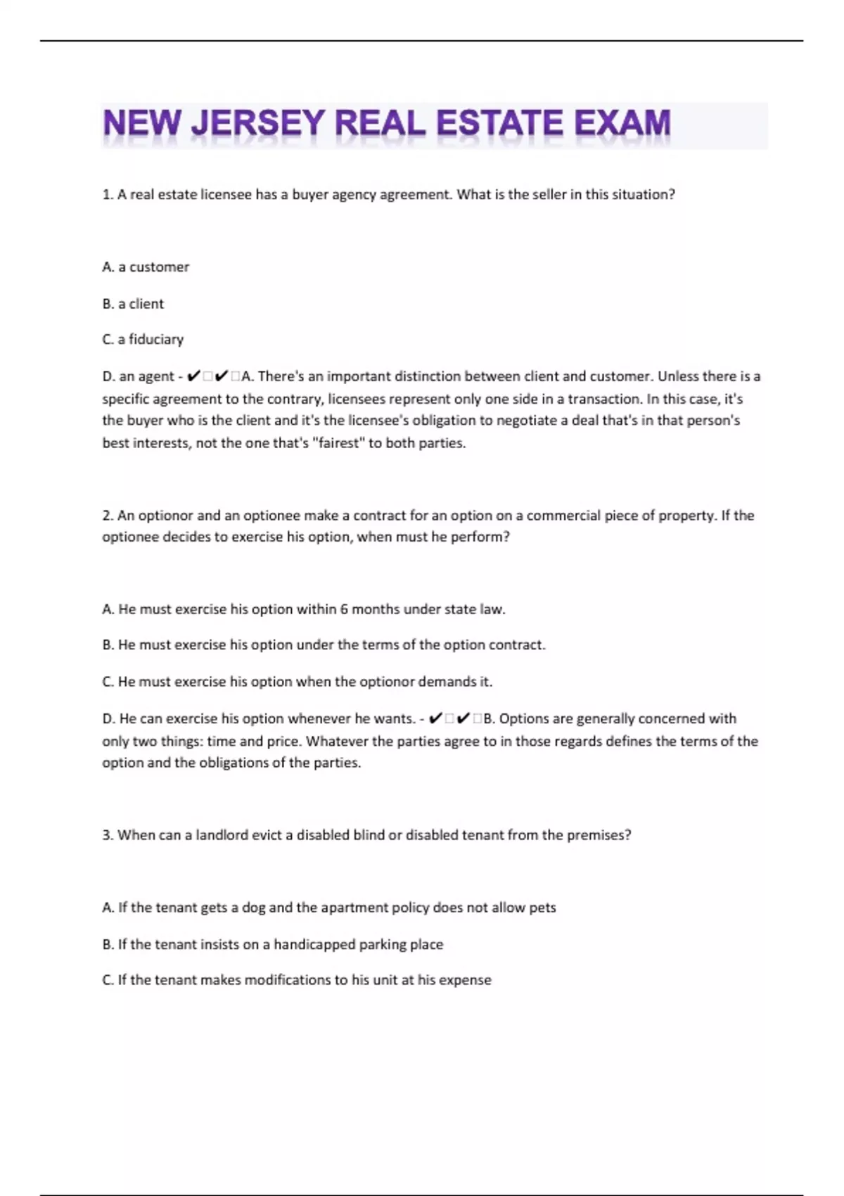 1. A real estate licensee has a buyer agency agreement. What is the seller in this situation? A. a customer B. a client C. a fiduciary D. an agent - ️️A. There's an important distinction between client and customer. Unless there is a specific agreement to the contrary, licensees represent only one side in a transaction. In this case, it's the buyer who is the client and it's the licensee's obligation to negotiate a deal that's in that person's best interests, not the one that's "fairest" to both parties. 2. An optionor and an optionee make a contract for an option on a commercial piece of property. If the optionee decides to exercise his option, when must he perform? A. He must exercise his option within 6 months under state law. B. He must exercise his option under the terms of the option contract. C. He must exercise his option when the optionor demands it. D. He can exercise his option whenever he wants. - ️️B. Options are generally concerned with only two things: time and price. Whatever the parties agree to in those regards defines the terms of the option and the obligations of the parties. 3. When can a landlord evict a disabled blind or disabled tenant from the premises? A. If the tenant gets a dog and the apartment policy does not allow pets B. If the tenant insists on a handicapped parking place C. If the tenant makes modifications to his unit at his expense D. If the tenant has loud parties and makes too much noise - ️️D. The law requires "reasonable accommodation"--for example, allowing a guide dog for a blind person even if there's a "no pets" policy. However, that does not mean that all rules are suspended. Noise, safety, and "use of premises policies" may still be enforced.