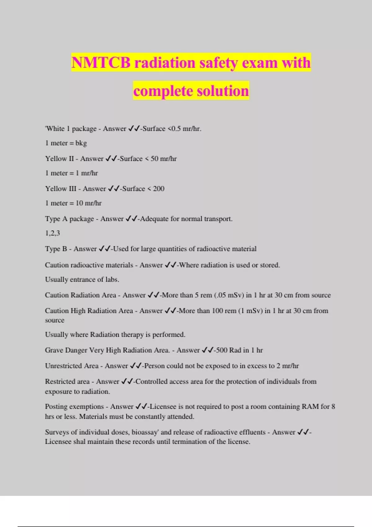 NMTCB radiation safety exam with complete solution 'White 1 package - Answer ️️ -Surface 0.5 mr/hr. 1 meter = bkg Yellow II - Answer ️️ -Surface 50 mr/hr 1 meter = 1 mr/hr Yellow III - Answer ️️ -Surface 200 1 meter = 10 mr/hr Type A package - Answer ️️ -Adequate for normal transport. 1,2,3 Type B - Answer ️️ -Used for large quantities of radioactive material Caution radioactive materials - Answer ️️ -Where radiation is used or stored. Usually entrance of labs. Caution Radiation Area - Answer ️️ -More than 5 rem (.05 mSv) in 1 hr at 30 cm from source Caution High Radiation Area - Answer ️️ -More than 100 rem (1 mSv) in 1 hr at 30 cm from source Usually where Radiation therapy is performed. Grave Danger Very High Radiation Area. - Answer ️️ -500 Rad in 1 hr Unrestricted Area - Answer ️️ -Person could not be exposed to in excess to 2 mr/hr Restricted area - Answer ️️ -Controlled access area for the protection of individuals from exposure to radiation. Posting exemptions - Answer ️️ -Licensee is not required to post a room containing RAM for 8 hrs or less. Materials must be constantly attended. Surveys of individual doses, bioassay' and release of radioactive effluents - Answer ️️ - Licensee shal maintain these records until termination of the license.