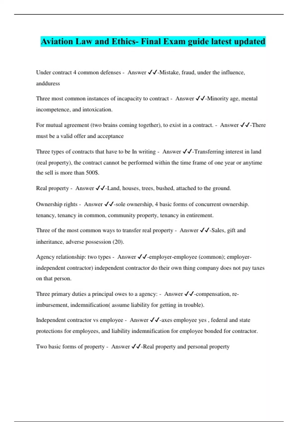Under contract 4 common defenses - Answer ️️-Mistake, fraud, under the influence, and duress Three most common instances of incapacity to contract - Answer ️️-Minority age, mental incompetence, and intoxication. For mutual agreement (two brains coming together), to exist in a contract. - Answer ️️-There must be a valid offer and acceptance
