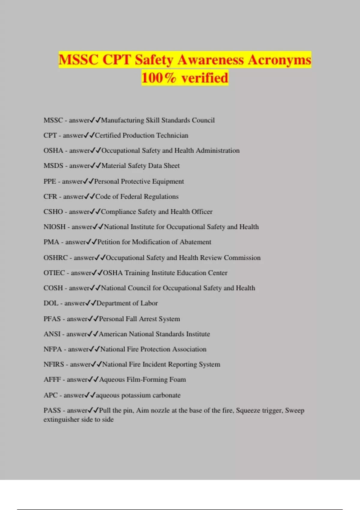 MSSC CPT Safety Awareness Acronyms 100% verified MSSC - answerManufacturing Skill Standards Council CPT - answerCertified Production Technician OSHA - answerOccupational Safety and Health Administration MSDS - answerMaterial Safety Data Sheet PPE - answerPersonal Protective Equipment CFR - answerCode of Federal Regulations CSHO - answerCompliance Safety and Health Officer NIOSH - answerNational Institute for Occupational Safety and Health PMA - answerPetition for Modification of Abatement OSHRC - answerOccupational Safety and Health Review Commission OTIEC - answerOSHA Training Institute Education Center COSH - answerNational Council for Occupational Safety and Health DOL - answerDepartment of Labor PFAS - answerPersonal Fall Arrest System ANSI - answerAmerican National Standards Institute NFPA - answerNational Fire Protection Association NFIRS - answerNational Fire Incident Reporting System