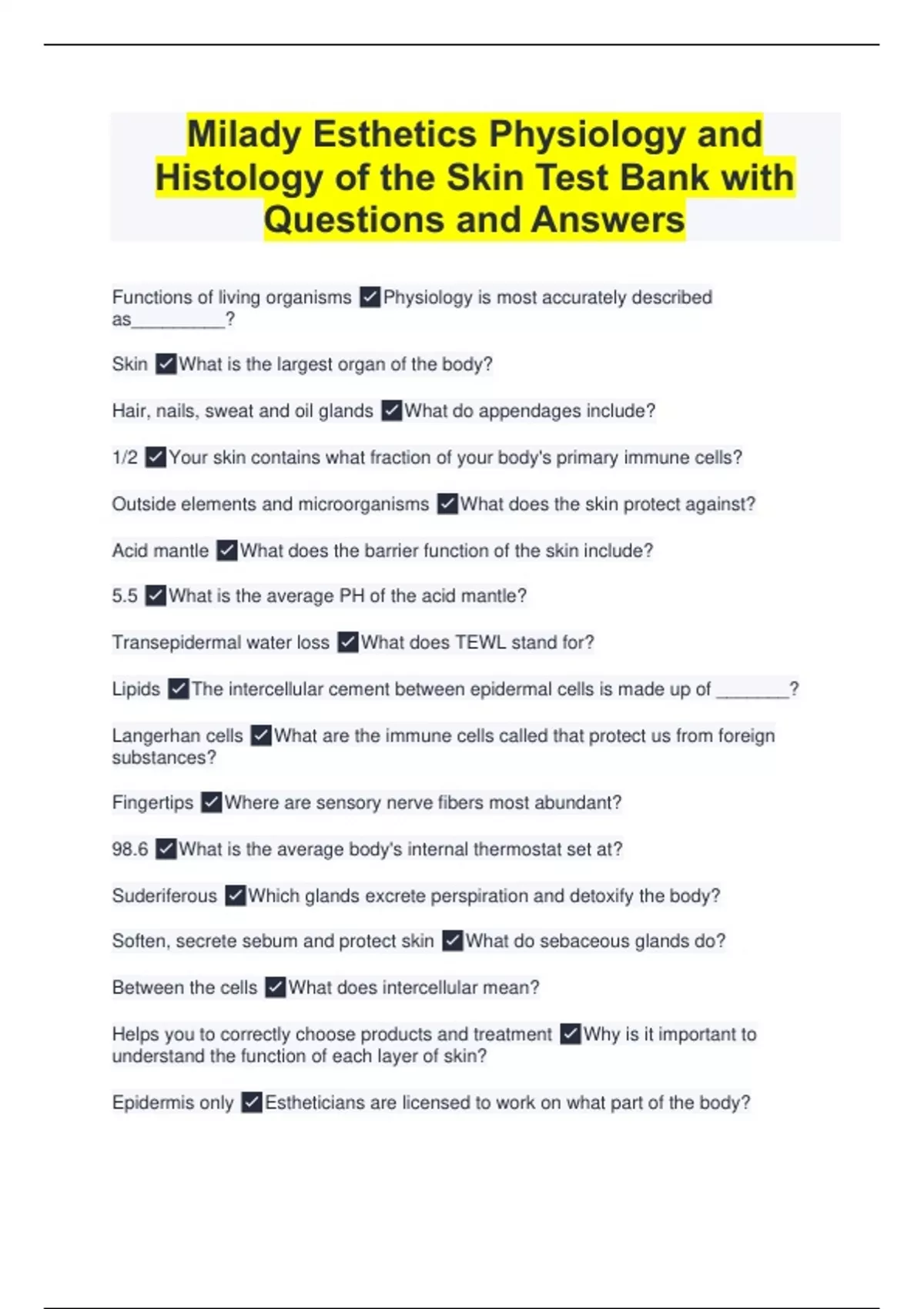 Milady Esthetics Physiology and Histology of the Skin Test Bank with Questions and Answers