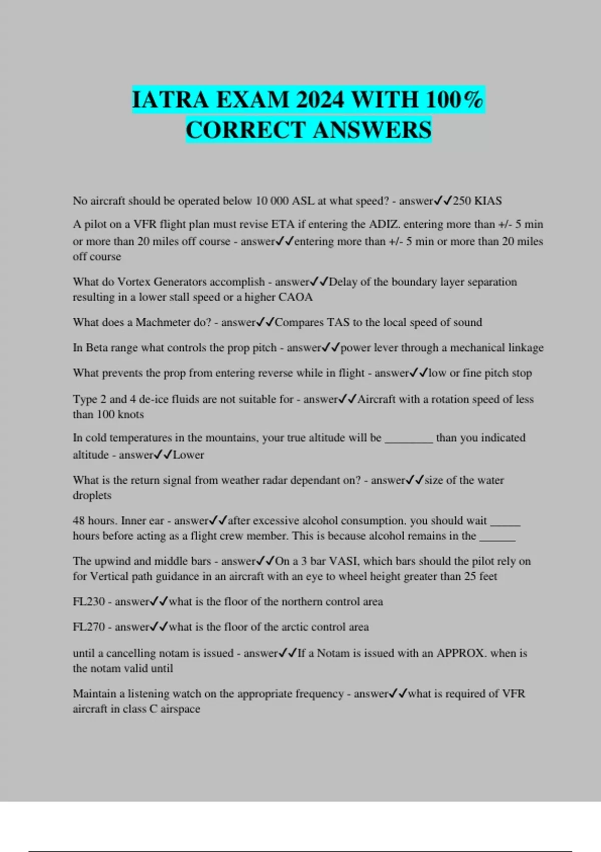 IATRA EXAM 2024 WITH 100% CORRECT ANSWERS No aircraft should be operated below 10 000 ASL at what speed? - answer250 KIAS A pilot on a VFR flight plan must revise ETA if entering the ADIZ. entering more than +/- 5 min or more than 20 miles off course - answerentering more than +/- 5 min or more than 20 miles off course What do Vortex Generators accomplish - answerDelay of the boundary layer separation resulting in a lower stall speed or a higher CAOA What does a Machmeter do? - answerCompares TAS to the local speed of sound In Beta range what controls the prop pitch - answerpower lever through a mechanical linkage What prevents the prop from entering reverse while in flight - answerlow or fine pitch stop Type 2 and 4 de-ice fluids are not suitable for - answerAircraft with a rotation speed of less than 100 knots In cold temperatures in the mountains, your true altitude will be ________ than you indicated altitude - answerLower What is the return signal from weather radar dependant on? - answersize of the water droplets 48 hours. Inner ear - answerafter excessive alcohol consumption. you should wait _____ hours before acting as a flight crew member. This is because alcohol remains in the ____