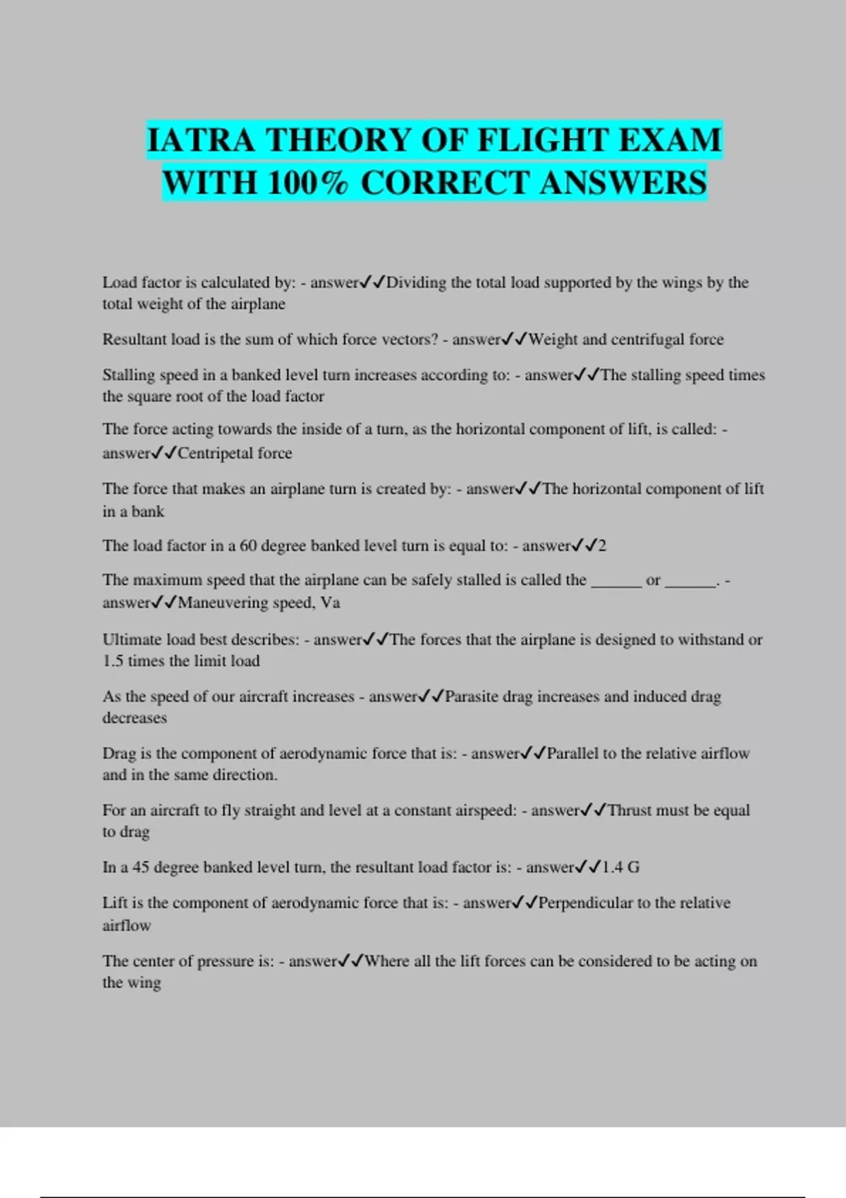 IATRA THEORY OF FLIGHT EXAM WITH 100% CORRECT ANSWERS Load factor is calculated by: - answerDividing the total load supported by the wings by the total weight of the airplane Resultant load is the sum of which force vectors? - answerWeight and centrifugal force Stalling speed in a banked level turn increases according to: - answerThe stalling speed times the square root of the load factor The force acting towards the inside of a turn, as the horizontal component of lift, is called: - answerCentripetal force The force that makes an airplane turn is created by: - answerThe horizontal component of lift in a bank The load factor in a 60 degree banked level turn is equal to: - answer2 The maximum speed that the airplane can be safely stalled is called the ______ or ______. - answerManeuvering speed, Va