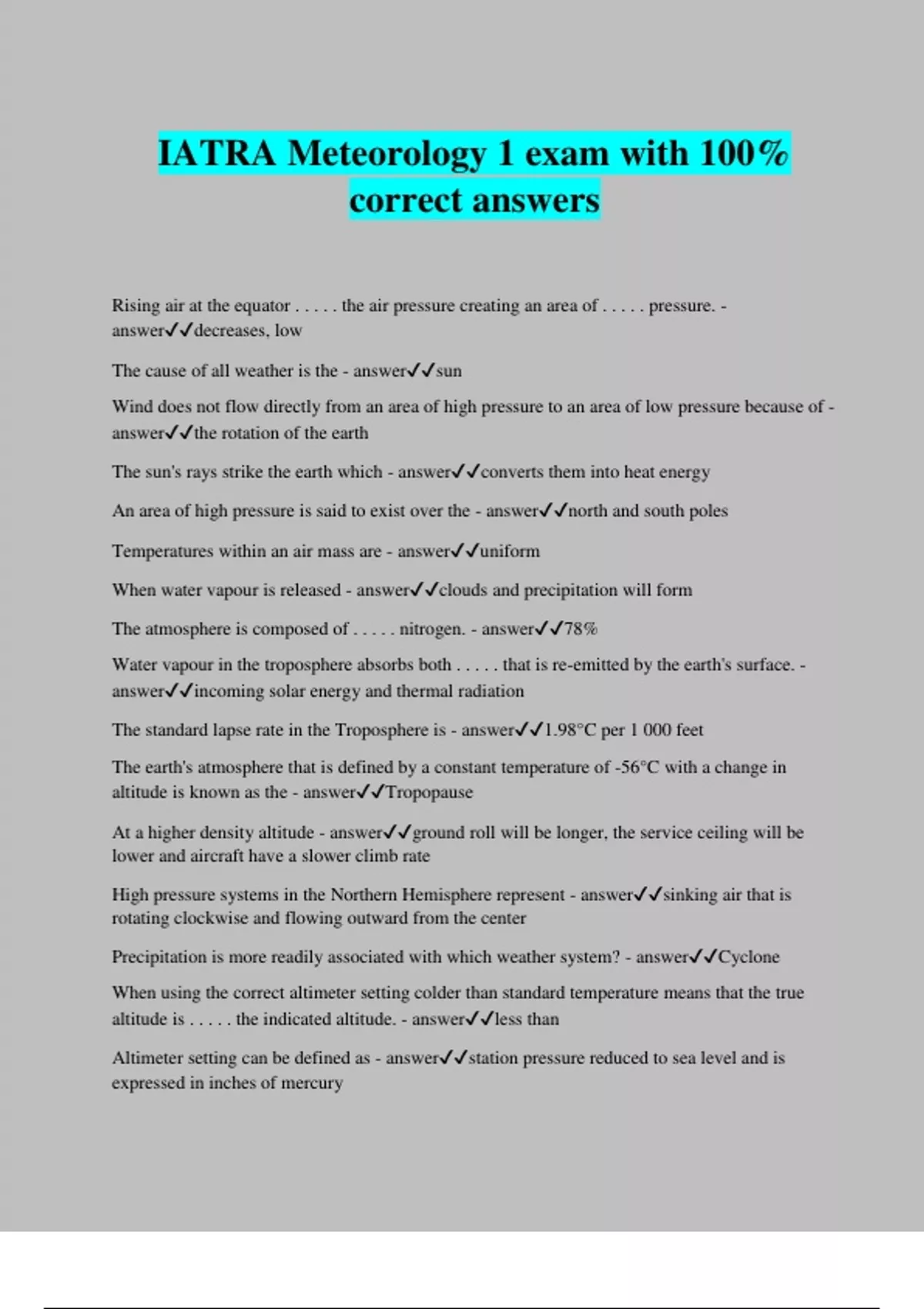 IATRA Meteorology 1 exam with 100% correct answers Rising air at the equator . . . . . the air pressure creating an area of . . . . . pressure. - answerdecreases, low The cause of all weather is the - answersun Wind does not flow directly from an area of high pressure to an area of low pressure because of - answerthe rotation of the earth The sun's rays strike the earth which - answerconverts them into heat energy An area of high pressure is said to exist over the - answernorth and south poles Temperatures within an air mass are - answeruniform When water vapour is released - answerclouds and precipitation will form The atmosphere is composed of . . . . . nitrogen. - answer78%