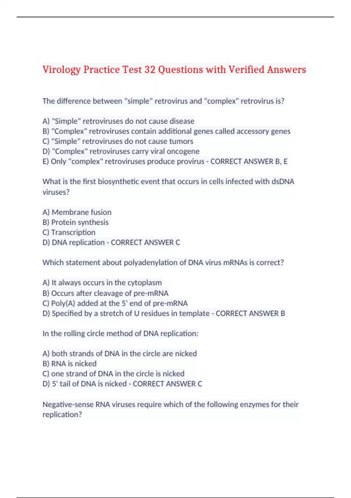 Virology Practice Test 32 Questions with Verified Answers The difference between "simple" retrovirus and "complex" retrovirus is? A) "Simple" retroviruses do not cause disease B) "Complex" retroviruses contain additional genes called accessory genes C) "Simple" retroviruses do not cause tumors D) "Complex" retroviruses carry viral oncogene E) Only "complex" retroviruses produce provirus - CORRECT ANSWER B, E What is the first biosynthetic event that occurs in cells infected with dsDNA viruses? A) Membrane fusion B) Protein synthesis C) Transcription D) DNA replication - CORRECT ANSWER C Which statement about polyadenylation of DNA virus mRNAs is correct? A) It always occurs in the cytoplasm B) Occurs after cleavage of pre-mRNA C) Poly(A) added at the 5' end of pre-mRNA D) Specified by a stretch of U residues in template - CORRECT ANSWER B In the rolling circle method of DNA replication: A) both strands of DNA in the circle are nicked B) RNA is nicked C) one strand of DNA in the circle is nicked D) 5' tail of DNA is nicked - CORRECT ANSWER C Negative-sense RNA viruses require which of the following enzymes for their replication? A) DNA dependent RNA polymerase B) Reverse transcriptase C) RNA dependent RNA polymerase D) RNA dependent DNA polymerase - CORRECT ANSWER C What is the first biosynthetic event that occurs in cells infected with negative-sense RNA viruses? A) Transcription B) Genome replication C) Protein synthesis D) Membrane fusion - CORRECT ANSWER A Which of the following statements concerning viral RNA synthesis is INCORRECT? A) The RNA genome must be copied end to end B) mRNAs must be produced that can be translated by the cell C) A viral RNA polymerase copies the viral RNA genome D) A positive-strand viral RNA must enter the cell together with an RNA polymerase - CORRECT ANSWER D In retrovirus replication, (Baltimore class VI), reverse transcription describes which one of the following: A) Converting viral RNA into proteins B) Converting viral RNA into DNA C) Converting viral DNA into RNA D) Converting proteins into viral RNA - CORRECT ANSWER B Protease inhibitors are a powerful group of anti-retroviral drugs which effectively: A) prevent viral genome integration into host chromosome B) block translation of viral mRNA C) inhibit reverse transcriptase D) inhibit post-translational cleavage of viral capsid proteins - CORRECT ANSWER D Which of the following are characteristic of inhibition of cellular gene expression by viral proteins? A) Inhibition of cellular pre-mRNA production B) Inhibition of polyadenylation of cellular pre-mRNA C) Inhibition of splicing of cellular pre-mRNA D) Inhibition of export of cellular mRNAs from the nucleus E) Inhibition of translation of cellular mRNAs F) Initiation of degradation of cellular mRNA - CORRECT ANSWER E Lipid droplets are depots for the storage of fatty acids in the form of triacylglycerols but in the following virus-infected cells, they are repurposed for assembly of virus particles A) HEP-C virus infected cells B) Rotavirus infected cells C) Poliovirus infected cells D) Poxvirus infected cells - CORRECT ANSWER A Which of the following statements about virus-host cell interactions is true? A) In a latent virus infection, the cell survives and the virus genome is lost B) In a latent virus infection, the cell survives and continuously produces virus at low levels C) In a latent virus infection, the virus genome persists but no complete virus particles are produced D) In a latent virus infection, the virus genome persists and the cell is transformed - CORRECT ANSWER True or False: replication of RNA virus genomes is accompanied by a low mutation rate because RNA-dependent RNA polymerases possess proofreading activity - CORRECT ANSWER True or False: influenza virus particles are released from infected cells via ESCRT-dependent budding - CORRECT ANSWER True or False: plant cells have no receptors for virus on their surface - CORRECT ANSWER true Inhibition of cellular gene expression by virus proteins Identify one viral gene product that: a. Regulates alternative splicing b. Inhibits splicing c. Suppresses polyadenylation at specific sites d. induces mRNA degradation e. Regulates RNA export from the nucleus - CORRECT ANSWER Matching: 1. Coronaviruses 2. Empty particle 3. ATPase motor 4. Lysogen 5. Herpesviruses 6. DNA primase 7. Chemokine receptor 8. Plasmodesmata 9. Bacteria lysis 10. Lipid droplets A. holin-endolysin pathway B. RNA primers C. Hepatitis C virus D. HIV E. viral genome expression F. nested set of mRNAs G. Tegument H. Prophage I. Type II Genome packaging system J. movement proteins - CORRECT ANSWER 1. 2. 3. 4. 5. 6. 7. 8. 9. 10. Define replicative intermediate - CORRECT ANSWER - characteristic of viral RNA replication - several RNA molecules are transcribed simultaneously from a single RNA template - the "antigenome" or (−) strand, which serves as a template for viral RNA synthesis Define complex retroviruses - CORRECT ANSWER - have additional genes - have evolved mechanism for nuclear entry in non-dividing cells - example: HIV Define LTRs - CORRECT ANSWER - long terminal repeats - Define pseudodiploid - CORRECT ANSWER - retrovirus genome is diploid since 2 RNA genomes are encapsidated - only 1 copy of integrated retroviral DNA is detected after infection by a single particle Define polycistronic mRNA - CORRECT ANSWER - virus gene codes for 2 or more proteins from 1 mRNA - ex. + sense RNA viruses Define virological synapses - CORRECT ANSWER specialized sites intercellular contact that form when infected cells contact uninfected neighbouring cells;results in intercellular transfer of virus Define lysogen - CORRECT ANSWER a bacterium containing a prophage Define cytopathic effects - CORRECT ANSWER changes in cell morphology caused by infecting virus Define inclusion bodies - CORRECT ANSWER - aka viroplasm - where viral replication and assembly occurs Define virus persistence - CORRECT ANSWER those in which the virus is not 