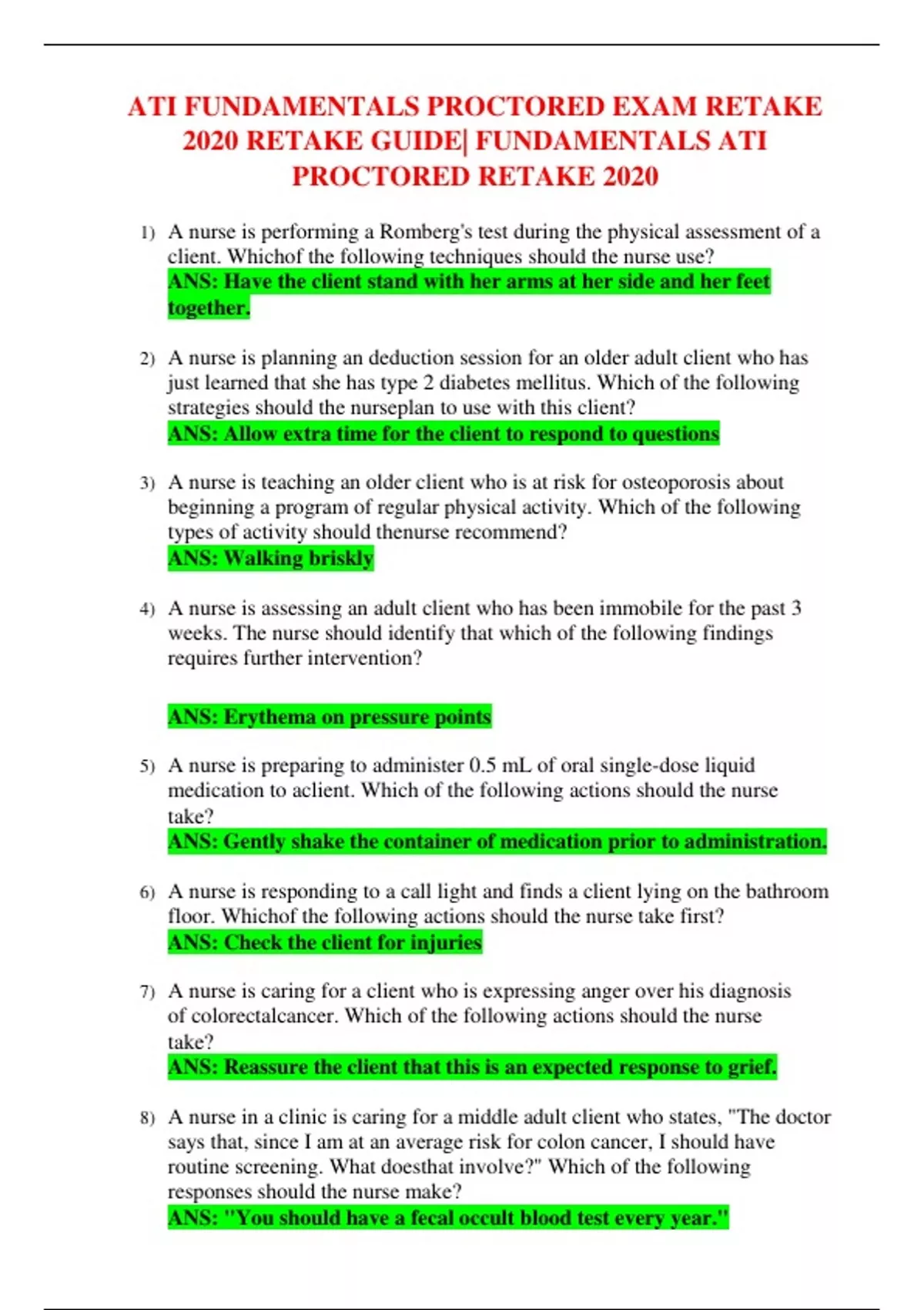 ATI FUNDAMENTALS PROCTORED EXAM RETAKE 2020 RETAKE GUIDE| FUNDAMENTALS ATI PROCTORED RETAKE 2020 1) A nurse is performing a Romberg's test during the physical assessment of a client. Whichof the following techniques should the nurse use? ANS: Have the client stand with her arms at her side and her feet together. 2) A nurse is planning an deduction session for an older adult client who has just learned that she has type 2 diabetes mellitus. Which of the following strategies should the nurseplan to use with this client? ANS: Allow extra time for the client to respond to questions 3) A nurse is teaching an older client who is at risk for osteoporosis about beginning a program of regular physical activity. Which of the following types of activity should thenurse recommend? ANS: Walking briskly