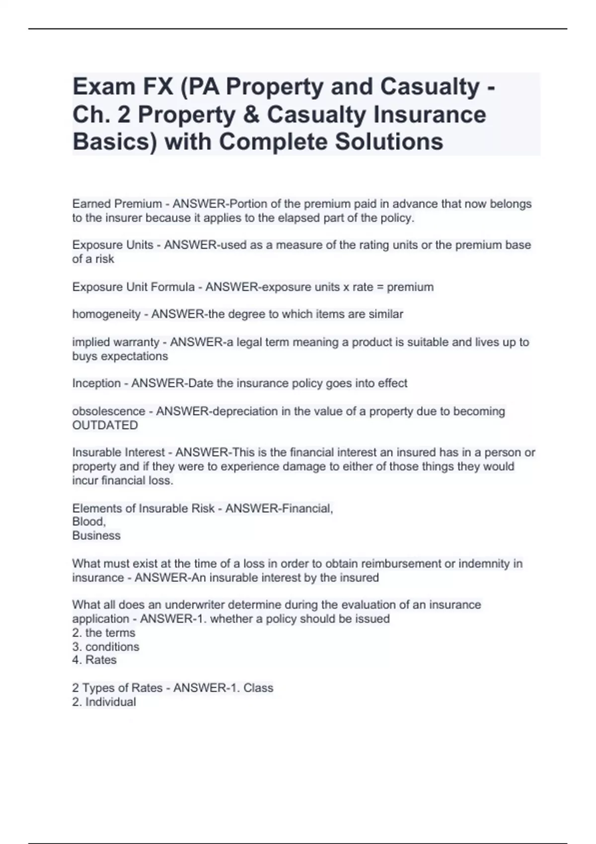 Exam FX- Michigan Property and Casualty Glossary with Complete SolutionsExam FX- Michigan Property and Casualty Glossary with Complete SolutionsExam FX- Michigan Property and Casualty Glossary with Complete Solutions Abandonment - ANSWER-The abdication of insured property into the hands of another, or into the possession of no one in particular. Accident - ANSWER-An unplanned, unforeseen event which occurs suddenly and at a specific place. Actual Cash Value (ACV) - ANSWER-The required amount to pay damages or for property loss, which is calculated based on the property's current replacement value minus depreciation. Additional Coverage - ANSWER-A provision in an insurance policy that allows for more coverage for specific loss expense without increase in premium.
