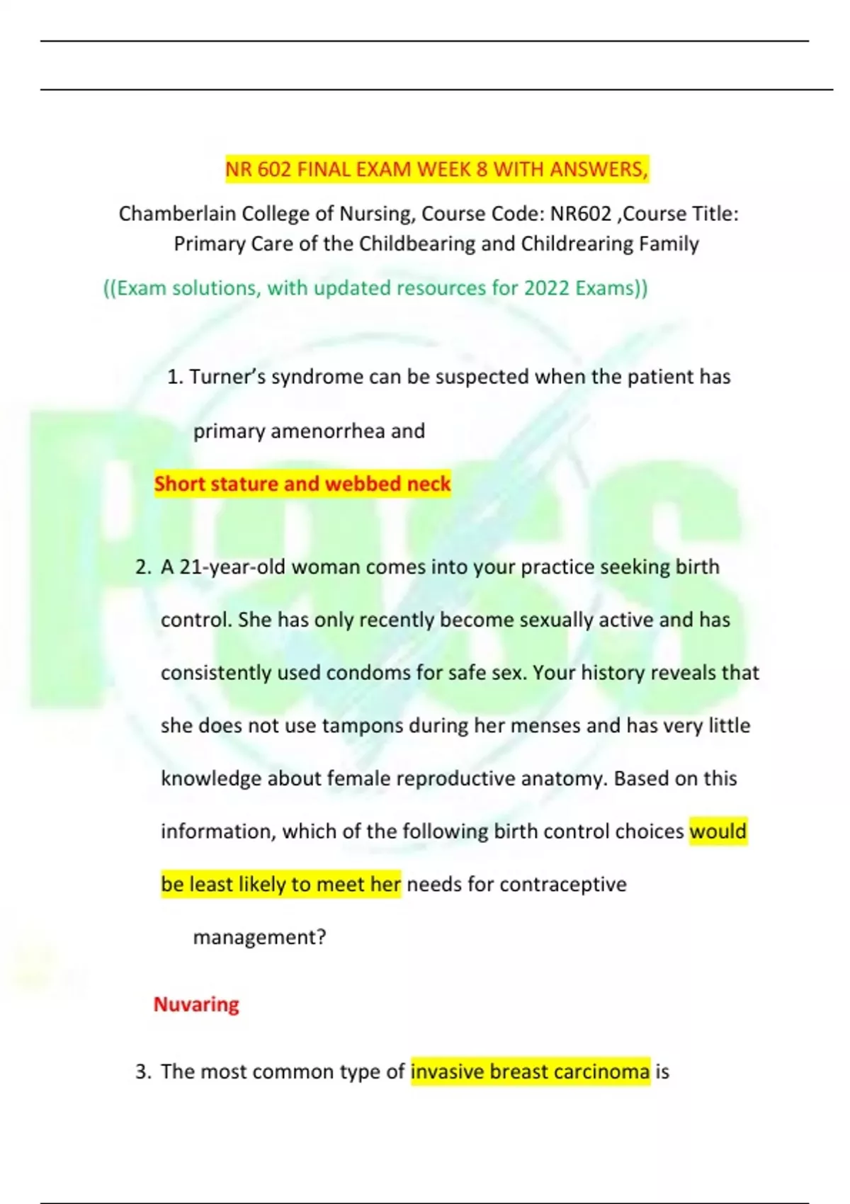 NR 602 FINAL EXAM WEEK 8 WITH ANSWERS, Chamberlain College of Nursing, Course Code: NR602 ,Course Title: Primary Care of the Childbearing and Childrearing Family ((Exam solutions, with updated resources for 2022 Exams)) 1. Turner’s syndrome can be suspected when the patient has primary amenorrhea and Short stature and webbed neck 2. A 21-year-old woman comes into your practice seeking birth control. She has only recently become sexually active and has consistently used condoms for safe sex. Your history reveals that she does not use tampons during her menses and has very little knowledge about female reproductive anatomy. Based on this information, which of the following birth control choices would be least likely to meet her needs for contraceptive management? Nuvaring 3. The most common type of invasive breast carcinoma is Infiltrating ductal 4. Measuring waist circumference is most appropriate when the client’s BMI places her in which of the following categories? Overweight 5. The American Cancer Society recommends yearly mammogram screening beginning at age:45 6. A dancer from an adult club down the street comes in for a renewal of her birth control pill prescription. She says that everything is fine. On examination, you find grayish-white vaginal discharge, greenish cervical discharge and cervical motion tenderness. All of the following differential diagnoses except? Gonorrhea, Interstitial cystitis, Bacterial vaginosis, chlamydia 7. Which of the following contraception would be best for a woman with sickle cell anemia? Progestin-only oral contraceptives 8. During a vaginal examination, you observe bulging of the anterior wall when you ask the patient to bear down. This is most likely a Cystocele 9. When examining the cervix of a 20-year-old-female, you note that most of the cervix ispink but there is a small ring of darkred tissue surrounding the os. This is most likely? The squamocolumnar junction 10. A sexually active 18-year-old presents with postcoital spotting, dysuria, and a yellow discharge. On exam you find her cervix is erythematous and bleeds with contact. The most likely diagnosis is Chlamydia 11. A 68-year-old female had her last cervical cancer screening done at age 65 and results were normal. She has no history of 1. Turner’s syndrome can be suspected when the patient has primary amenorrhea and Short stature and webbed neck 2. A 21-year-old woman comes into your practice seeking birth control. She has only recently become sexually active and has consistently used condoms for safe sex. Your history reveals that she does not use tampons during her menses and has very little knowledge about female reproductive anatomy. Based on this information, which of the following birth control choices would be least likely to meet her needs for contraceptive management? Nuvaring 3. The most common type of invasive breast carcinoma is Infiltrating ductal 4. Measuring waist circumference is most appropriate when the client’s BMI places her in which of the following categories? Overweight 5. The American Cancer Society recommends yearly mammogram screening beginning at age:45 6. A dancer from an adult club down the street comes in for a renewal of her birth control pill prescription. She says that everything is fine. On examination, you find grayish-white vaginal discharge, greenish cervical discharge and cervical motion tenderness. All of the following differential diagnoses except? Gonorrhea, Interstitial cystitis, Bacterial vaginosis, chlamydia 7. Which of the following contraception would be best for a woman with sickle cell anemia? Progestin-only oral contraceptives 8. During a vaginal examination, you observe bulging of the anterior wall when you ask the patient to bear down. This is most likely a Cystocele 9. When examining the cervix of a 20-year-old-female, you note that most of the cervix ispink but there is a small ring of darkred tissue surrounding the os. This is most likely? The squamocolumnar junction 10. A sexually active 18-year-old presents with postcoital spotting, dysuria, and a yellow discharge. On exam you find her cervix is erythematous and bleeds with contact. The most likely diagnosis is Chlamydia 11. A 68-year-old female had her last cervical cancer screening done at age 65 and results were normal. She has no history of