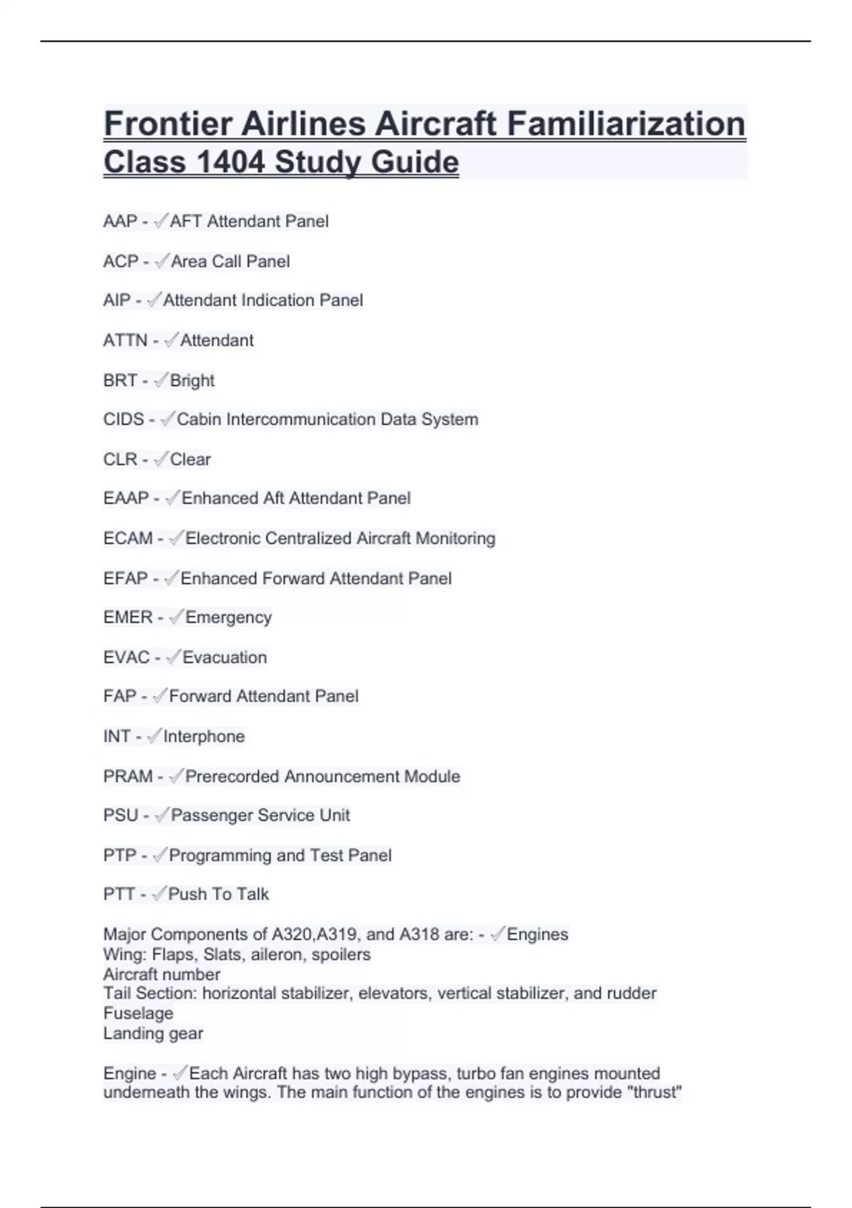 Frontier Airlines Aircraft Familiarization Class 1404 Study Guide