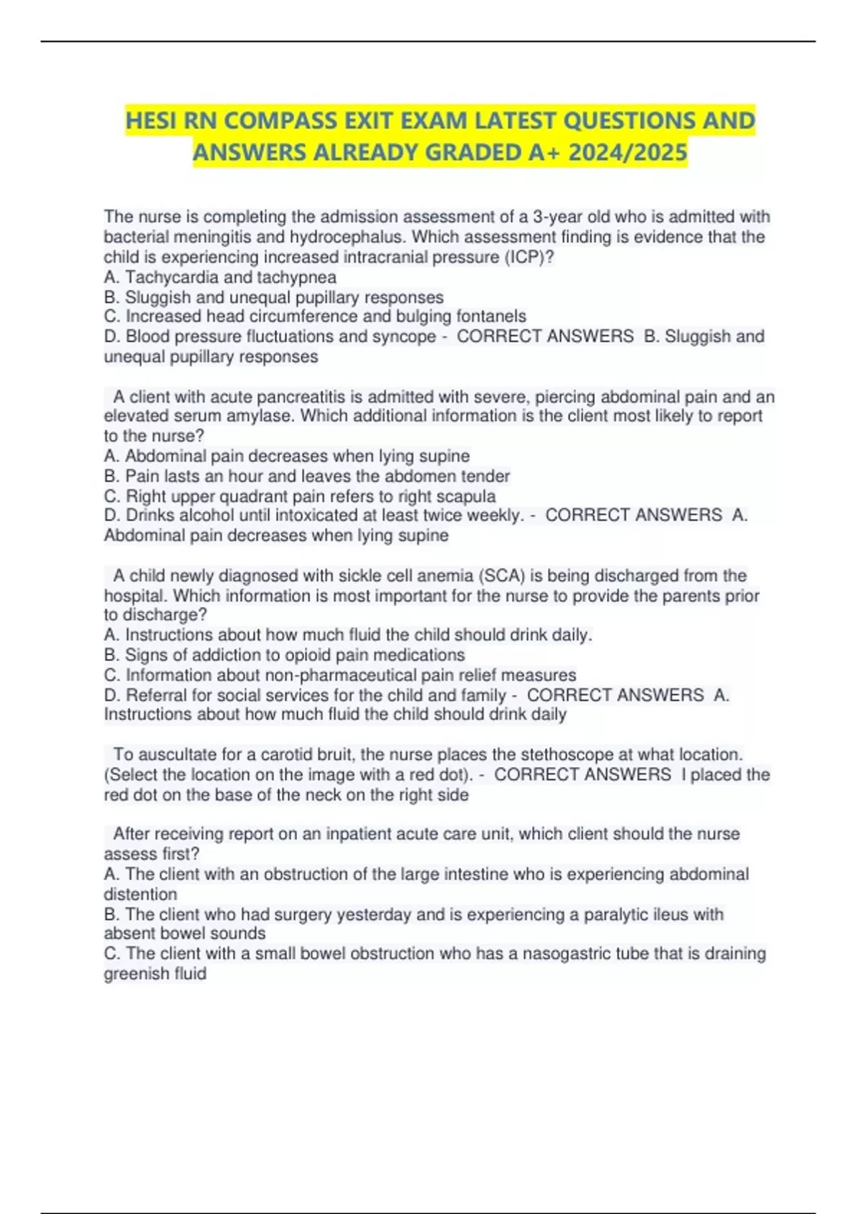 HESI RN COMPASS EXIT EXAM LATEST QUESTIONS AND ANSWERS ALREADY GRADED A+ 2024/2025 The nurse is completing the admission assessment of a 3-year old who is admitted with bacterial meningitis and hydrocephalus. Which assessment finding is evidence that the child is experiencing increased intracranial pressure (ICP)? A. Tachycardia and tachypnea B. Sluggish and unequal pupillary responses C. Increased head circumference and bulging fontanels D. Blood pressure fluctuations and syncope - CORRECT ANSWERS B. Sluggish and unequal pupillary responses A client with acute pancreatitis is admitted with severe, piercing abdominal pain and an elevated serum amylase. Which additional information is the client most likely to report to the nurse? A. Abdominal pain decreases when lying supine B. Pain lasts an hour and leaves the abdomen tender C. Right upper quadrant pain refers to right scapula D. Drinks alcohol until intoxicated at least twice weekly. - CORRECT ANSWERS A. Abdominal pain decreases when lying supine A child newly diagnosed with sickle cell anemia (SCA) is being discharged from the hospital. Which information is most important for the nurse to provide the parents prior to discharge? A. Instructions about how much fluid the child should drink daily. B. Signs of addiction to opioid pain medications C. Information about non-pharmaceutical pain relief measures D. Referral for social services for the child and family - CORRECT ANSWERS A. Instructions about how much fluid the child should drink daily To auscultate for a carotid bruit, the nurse places the stethoscope at what location. (Select the location on the image with a red dot). - CORRECT ANSWERS I placed the red dot on the base of the neck on the right side After receiving report on an inpatient acute care unit, which client should the nurse assess first? A. The client with an obstruction of the large intestine who is experiencing abdominal distention B. The client who had surgery yesterday and is experiencing a paralytic ileus with absent bowel sounds C. The client with a small bowel obstruction who has a nasogastric tube that is draining greenish fluid D. The client with a bowel obstruction due to a volvulus who is experiencing abdominal rigidity - CORRECT ANSWERS D. The client with a bowel obstruction due to a volvulus who is experiencing abdominal rigidity A teenager presents to the emergency department with palpitations after vaping at a party. The client is anxious, fearful, and hyperventilating. The nurse anticipates the client developing which acid base imbalance? A. Respiratory acidosis B. Metabolic alkalosis C. Metabolic acidosis D. Respiratory alkalosis - CORRECT ANSWERS D. Respiratory alkalosis A client with dyspnea is being admitted to the medical unit. To best prepare for the client's arrival, the nurse should ensure that the client's bed is in which position? A. Supine B. supine; feet elevated higher than head C. supine; head elevated higher than feet D. Fowlers - CORRECT ANSWERS Fowlers The nurse is taking the blood pressure measurement of a client with Parkinson's disease. Which information in the client's admission assessment is relevant to the nurse's plan for taking the blood pressure reading? (Select all the apply) A. Frequent syncope B. Occasional nocturia C. Flat affect D. Blurred vision E. Frequent drooling - CORRECT ANSWERS A. Frequent syncope C. Flat affect D. Blurred vision While caring for a client's postoperative dressing, the nurse observes purulent drainage at the wound. Before reporting this finding to the healthcare provider, the nurse should review which of the client's laboratory values? A. Serum albumin B. Culture for sensitive organisms C. Serum blood glucose level D. Creatinine level - CORRECT ANSWERS B. Culture for sensitive organisms A preschool-aged boy is admitted to the pediatric unit following successful resuscitation from a near-drowning incident. While providing care to the child, the nurse begins talking with his preadolescent brother who rescued the child from the swimming pool and initiated resuscitation. The nurse notices the older boy becomes withdrawn when asked about what happened. Which action should the nurse take? A. Develop a water safety teaching plan for the family B. Ask the older brother how he felt during the incident C. Tell the older brother that he seems depressed D. Commend the older brother for his heroic actions - CORRECT ANSWERS B. Ask the older brother how he felt during the incident A male client with cirrhosis has jaundice and pruritus. He tells the nurse that he has been soaking in hot baths at night with no relief of his discomfort. Which action should the nurse take? A. Encourage the client to use cooler water and apply calamine lotion after soaking B. Obtain a PRN prescription for an analgesic that the client can use for symptom relief C. Suggest that the client take brief showers and apply oil-based lotion after showering D. Explain that the symptoms are caused by liver damage and cannot be relieved - CORRECT ANSWERS A. Encourage the client to use cooler water and apply calamine lotion after soaking An older client with a long history of coronary artery disease (CAD), hypertension (HTN), and heart failure (HF) arrives in the Emergency Department (ED) in respiratory distress. The healthcare provider prescribes furosemide IV. Which therapeutic response to furosemide should the nurse expected in the client with acute HF? A. Increased cardiac contrac