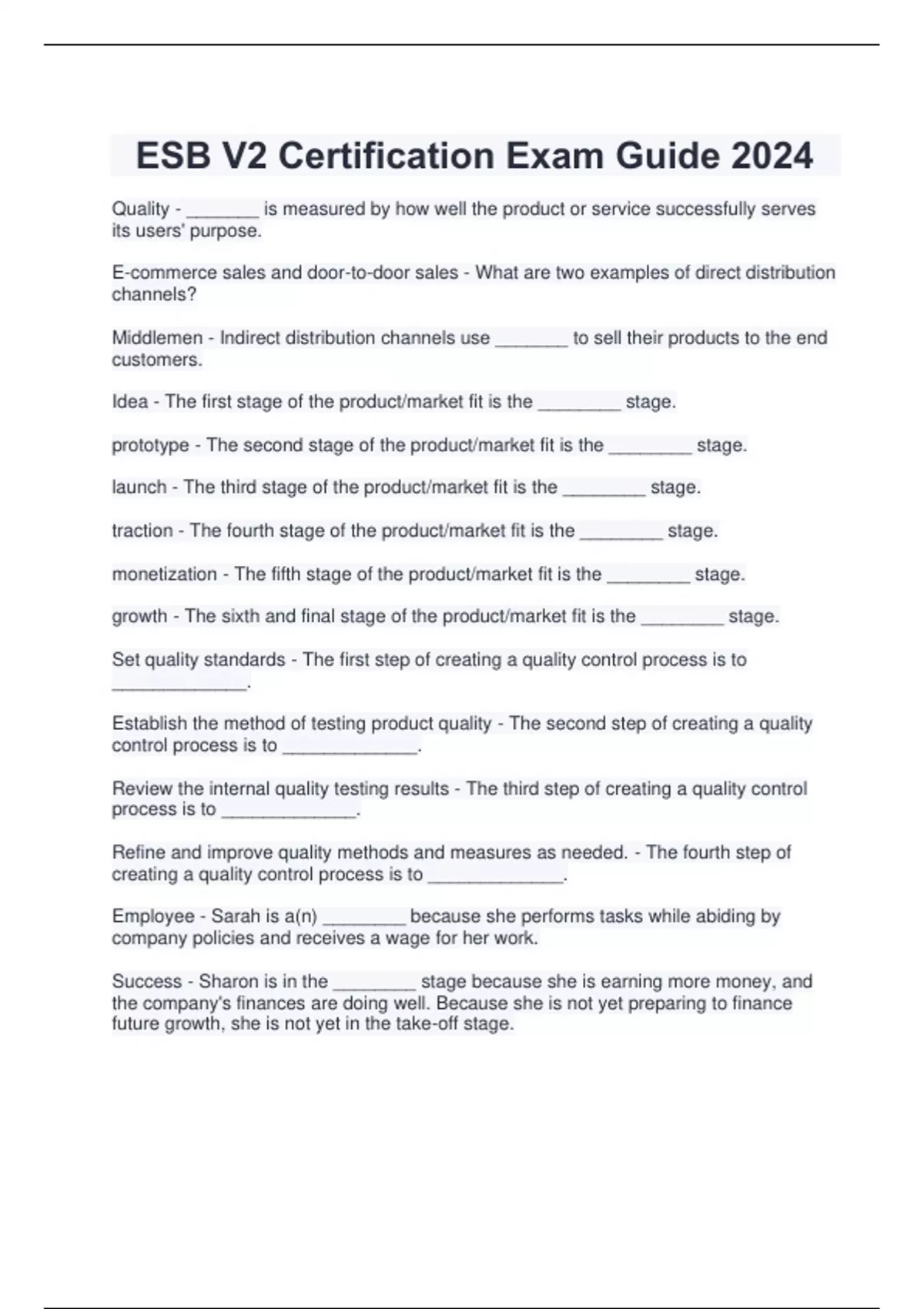 Quality - _______ is measured by how well the product or service successfully serves its users' purpose. E-commerce sales and door-to-door sales - What are two examples of direct distribution channels? Middlemen - Indirect distribution channels use _______ to sell their products to the end customers. Idea - The first stage of the product/market fit is the ________ stage. prototype - The second stage of the product/market fit is the ________ stage. launch - The third stage of the product/market fit is the ________ stage. traction - The fourth stage of the product/market fit is the ________ stage. monetization - The fifth stage of the product/market fit is the ________ stage. growth - The sixth and final stage of the product/market fit is the ________ stage. Set quality standards - The first step of creating a quality control process is to _____________. Establish the method of testing product quality - The second step of creating a quality control process is to _____________. Review the internal quality testing results - The third step of creating a quality control process is to _____________. Refine and improve quality methods and measures as needed. - The fourth step of creating a quality control process is to _____________. Employee - Sarah is a(n) ________ because she performs tasks while abiding by company policies and receives a wage for her work. Success - Sharon is in the ________ stage because she is earning more money, and the company's finances are doing well. Because she is not yet preparing to finance future growth, she is not yet in the take-off stage.