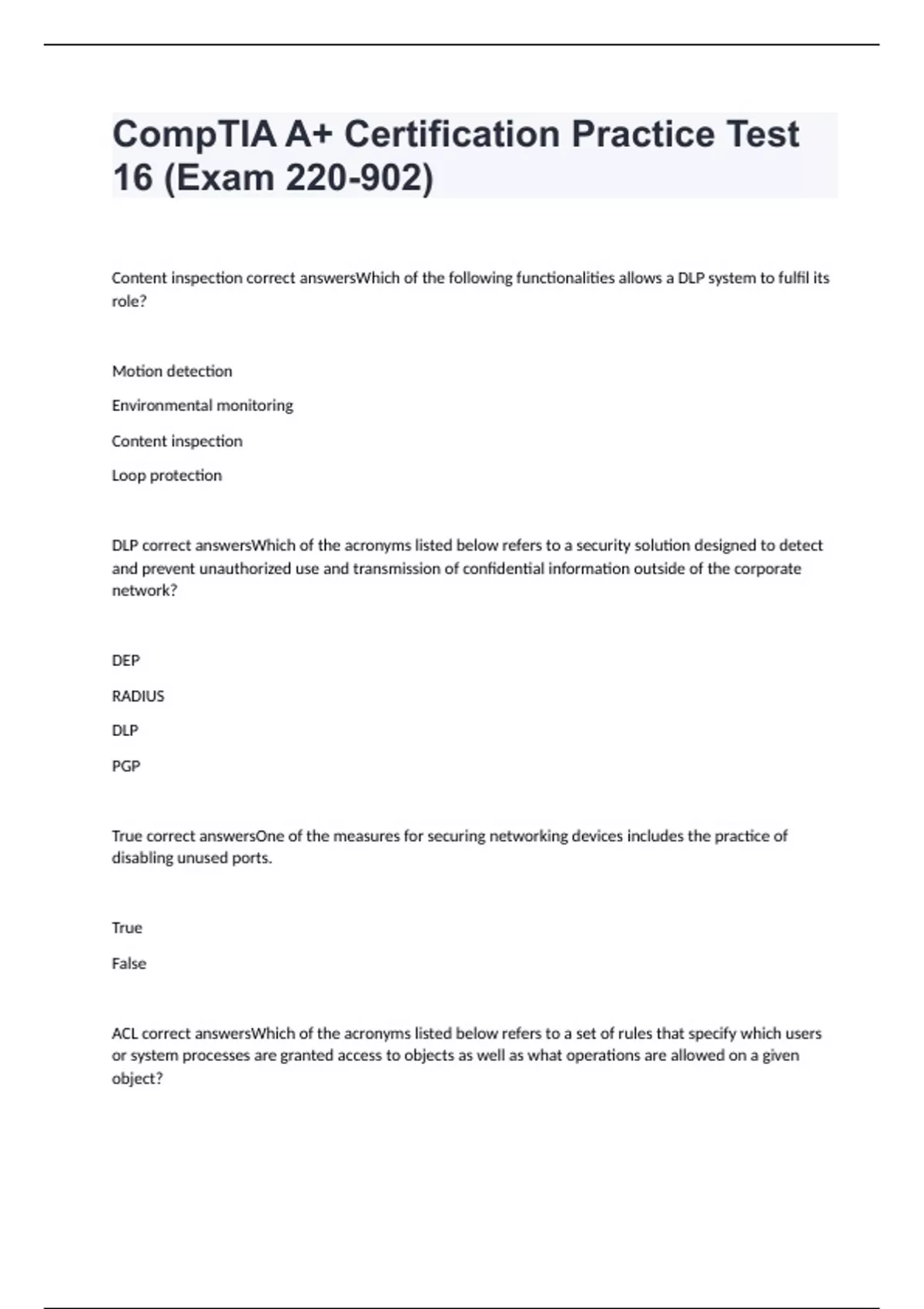 Content inspection correct answersWhich of the following functionalities allows a DLP system to fulfil its role? Motion detection Environmental monitoring Content inspection Loop protection DLP correct answersWhich of the acronyms listed below refers to a security solution designed to detect and prevent unauthorized use and transmission of confidential information outside of the corporate network? DEP RADIUS DLP PGP True correct answersOne of the measures for securing networking devices includes the practice of disabling unused ports. True False ACL correct answersWhich of the acronyms listed below refers to a set of rules that specify which users or system processes are granted access to objects as well as what operations are allowed on a given object?