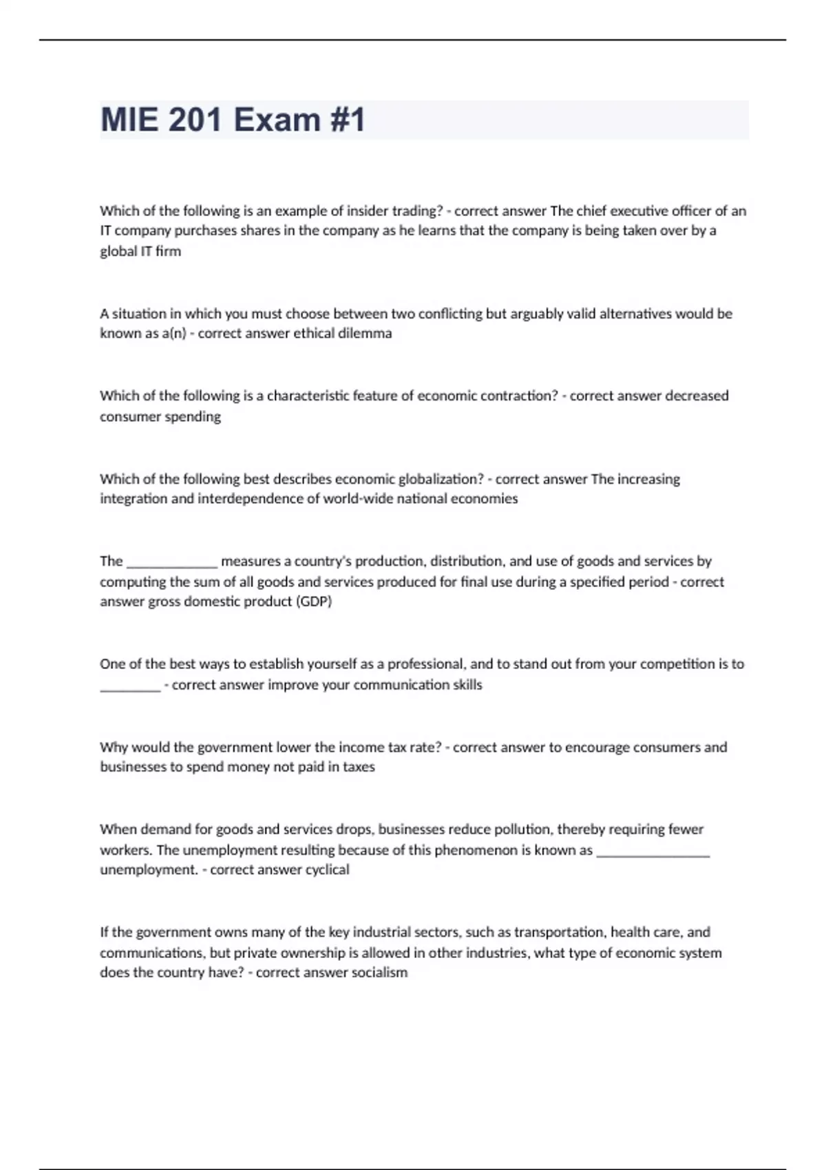 MIE 201 Exam #1Which of the following is an example of insider trading? - correct answer The chief executive officer of an IT company purchases shares in the company as he learns that the company is being taken over by a global IT firm A situation in which you must choose between two conflicting but arguably valid alternatives would be known as a(n) - correct answer ethical dilemma Which of the following is a characteristic feature of economic contraction? - correct answer decreased consumer spending Which of the following best describes economic globalization? - correct answer The increasing integration and interdependence of world-wide national economies The ____________ measures a country's production, distribution, and use of goods and services by computing the sum of all goods and services produced for final use during a specified period - correct answer gross domestic product (GDP) One of the best ways to establish yourself as a professional, and to stand out from your competition is to ________ - correct answer improve your communication skills Why would the government lower the income tax rate? - correct answer to encourage consumers and businesses to spend money not paid in taxes When demand for goods and services drops, businesses reduce pollution, thereby requiring fewer workers. The unemployment resulting because of this phenomenon is known as _______________ unemployment. - correct answer cyclical If the government owns many of the key industrial sectors, such as transportation, health care, and communications, but private ownership is allowed in other industries, what type of economic system does the country have? - correct answer socialism
