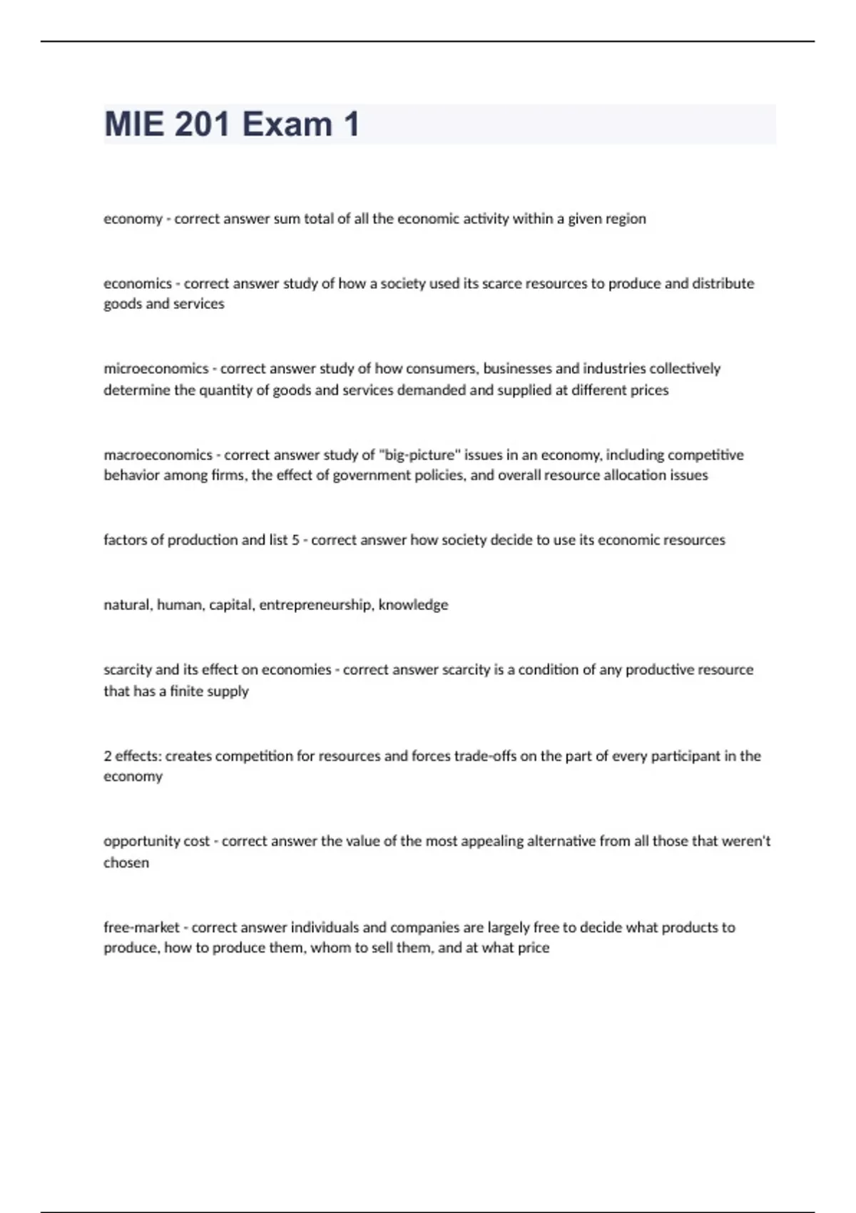 MIE 201 Exam 1economy - correct answer sum total of all the economic activity within a given region economics - correct answer study of how a society used its scarce resources to produce and distribute goods and services microeconomics - correct answer study of how consumers, businesses and industries collectively determine the quantity of goods and services demanded and supplied at different prices macroeconomics - correct answer study of "big-picture" issues in an economy, including competitive behavior among firms, the effect of government policies, and overall resource allocation issues factors of production and list 5 - correct answer how society decide to use its economic resources natural, human, capital, entrepreneurship, knowledge scarcity and its effect on economies - correct answer scarcity is a condition of any productive resource that has a finite supply 2 effects: creates competition for resources and forces trade-offs on the part of every participant in the economy opportunity cost - correct answer the value of the most appealing alternative from all those that weren't chosen free-market - correct answer individuals and companies are largely free to decide what products to produce, how to produce them, whom to sell them, and at what price