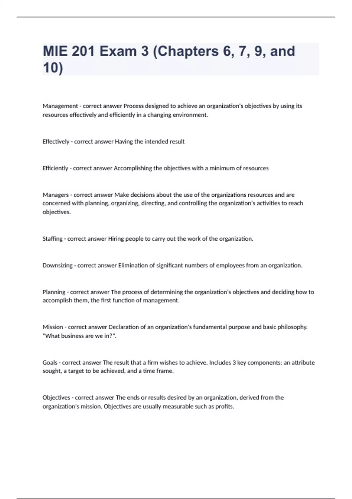 MIE 201 Exam 3 (Chapters 6, 7, 9, and 10)Management - correct answer Process designed to achieve an organization's objectives by using its resources effectively and efficiently in a changing environment. Effectively - correct answer Having the intended result Efficiently - correct answer Accomplishing the objectives with a minimum of resources Managers - correct answer Make decisions about the use of the organizations resources and are concerned with planning, organizing, directing, and controlling the organization's activities to reach objectives. Staffing - correct answer Hiring people to carry out the work of the organization. Downsizing - correct answer Elimination of significant numbers of employees from an organization. Planning - correct answer The process of determining the organization's objectives and deciding how to accomplish them, the first function of management. Mission - correct answer Declaration of an organization's fundamental purpose and basic philosophy. "What business are we in?". Goals - correct answer The result that a firm wishes to achieve. Includes 3 key components: an attribute sought, a target to be achieved, and a time frame. Objectives - correct answer The ends or results desired by an organization, derived from the organization's mission. Objectives are usually measurable such as profits. Strategic plans - correct answer Establish the long-range objectives and overall strategy or course of action by which the firm fulfills its mission. Generally cover periods of one year or longer. Tactical plans - correct answer Short range and designed to implement the activities and objectives specified in the strategic plan. Usually cover a period of one year or less, helping to stay on course for strategic plans. Operational plans - correct answer Very short term and specify what actions specific individuals, work groups, or departments need to accomplish in order to achieve the tactical plan and ultimately the strategic plan. Apply to month, week, or even day periods. Crisis management/Contingency planning - correct answer Deals with potential disasters such as product tampering, oil spills, fire, earthquake, computer viruses, or even a reputation crisis. Organizing - correct answer Structuring of resources and activities to accomplish objectives in an efficient and effective manner. Directing - correct answer Motivating and leading employees to achieve organizational objectives. Telling employees what to do and when to do it through the implementation of deadlines and encouragement. Controlling - correct answer Process of evaluating and correcting activities to keep the organization on course. Involves five activities: measuring performance, comparing present performance with standards or objectives, identifying deviations from the standards, investigating the causes of deviations, and taking corrective action when necessary. Top managers - correct answer Include the president and other top executives, such as the chief executive officer (CEO), chief financial officer (CFO), and chief operations officer (COO), who have overall responsibility for the organization. CEO - correct answer Chief executive officer. Manages the overall strategic direction of the company and plays a key role in representing the company to stakeholders. COO - correct answer Chief operations officer. Responsible for daily operations of the company. Reports to the CEO and is often considered number 2 in command.