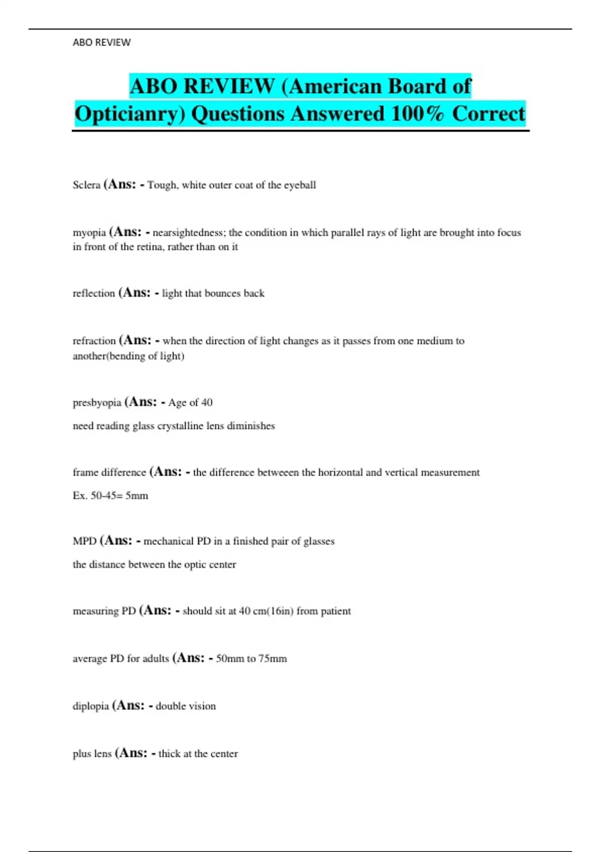 ABO REVIEW (American Board of Opticianry) Questions Answered 100% Correct Sclera (Ans: - Tough, white outer coat of the eyeball myopia (Ans: - nearsightedness; the condition in which parallel rays of light are brought into focus in front of the retina, rather than on it reflection (Ans: - light that bounces back refraction (Ans: - when the direction of light changes as it passes from one medium to another(bending of light) presbyopia (Ans: - Age of 40 need reading glass crystalline lens diminishes