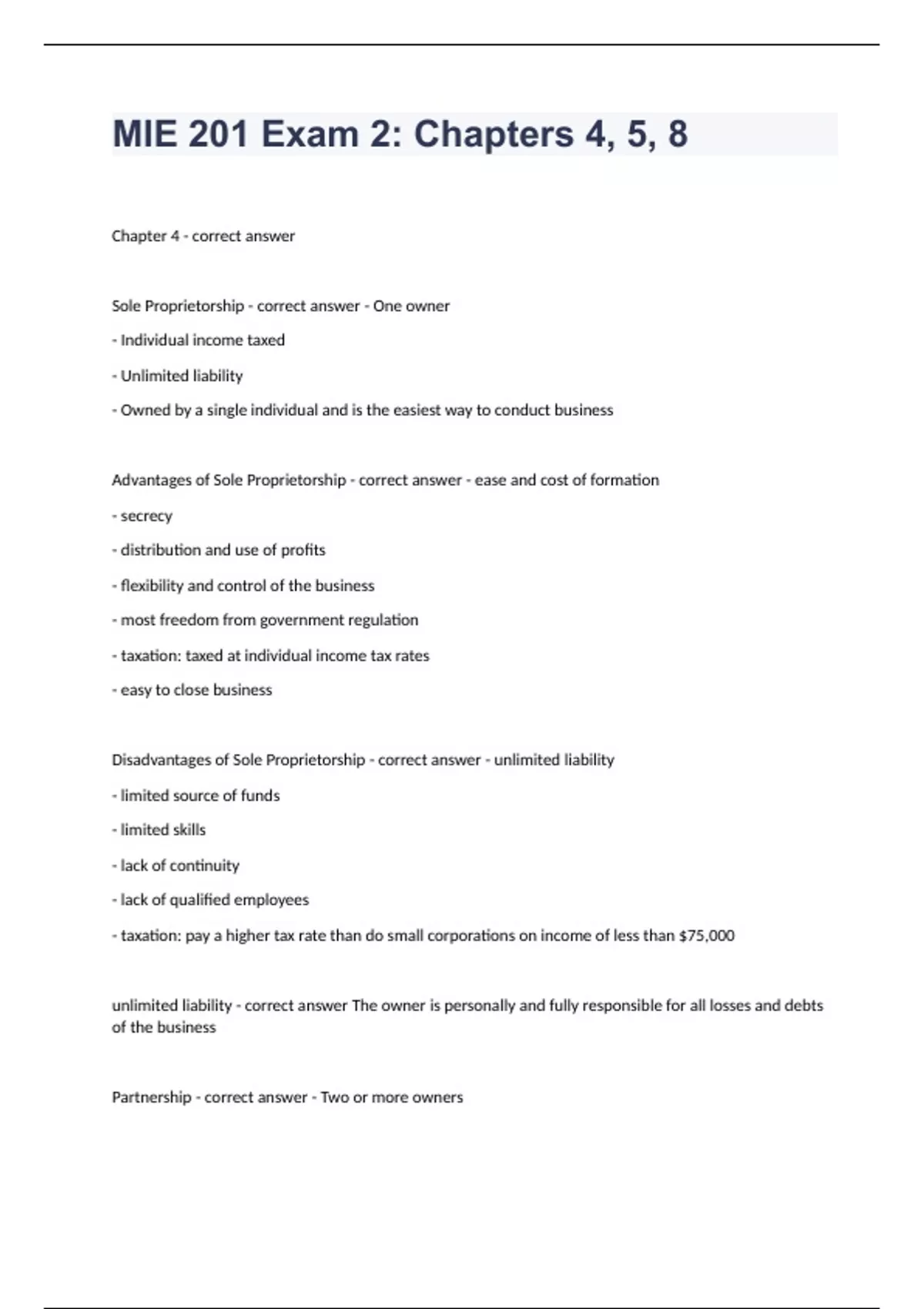 MIE 201 Exam 2: Chapters 4, 5, 8Chapter 4 - correct answer Sole Proprietorship - correct answer - One owner - Individual income taxed - Unlimited liability - Owned by a single individual and is the easiest way to conduct business Advantages of Sole Proprietorship - correct answer - ease and cost of formation - secrecy - distribution and use of profits - flexibility and control of the business - most freedom from government regulation - taxation: taxed at individual income tax rates - easy to close business Disadvantages of Sole Proprietorship - correct answer - unlimited liability - limited source of funds - limited skills - lack of continuity - lack of qualified employees - taxation: pay a higher tax rate than do small corporations on income of less than $75,000 unlimited liability - correct answer The owner is personally and fully responsible for all losses and debts of the business Partnership - correct answer - Two or more owners