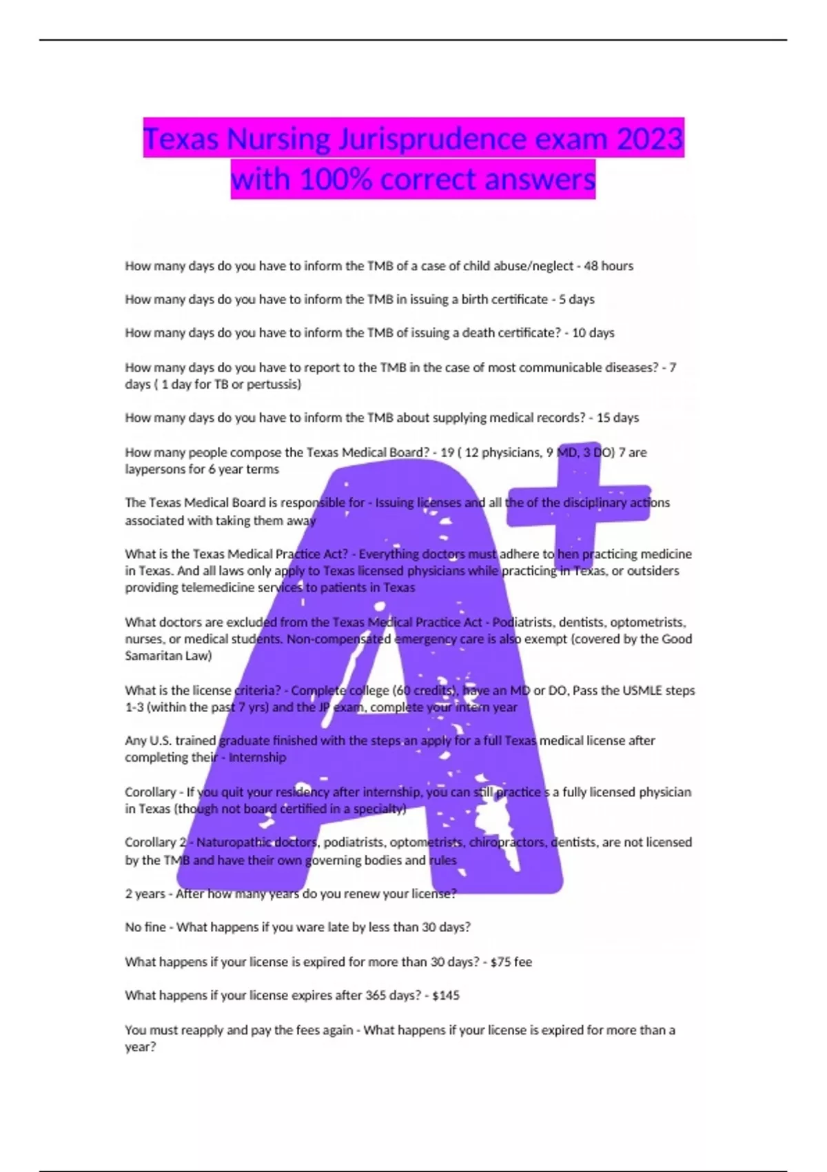 How many days do you have to inform the TMB of a case of child abuse/neglect - 48 hours How many days do you have to inform the TMB in issuing a birth certificate - 5 days How many days do you have to inform the TMB of issuing a death certificate? - 10 days How many days do you have to report to the TMB in the case of most communicable diseases? - 7 days ( 1 day for TB or pertussis) How many days do you have to inform the TMB about supplying medical records? - 15 days How many people compose the Texas Medical Board? - 19 ( 12 physicians, 9 MD, 3 DO) 7 are laypersons for 6 year terms The Texas Medical Board is responsible for - Issuing licenses and all the of the disciplinary actions associated with taking them away What is the Texas Medical Practice Act? - Everything doctors must adhere to hen practicing medicine in Texas. And all laws only apply to Texas licensed physicians while practicing in Texas, or outsiders providing telemedicine services to patients in Texas What doctors are excluded from the Texas Medical Practice Act - Podiatrists, dentists, optometrists, nurses, or medical students. Non-compensated emergency care is also exempt (covered by the Good Samaritan Law) What is the license criteria? - Complete college (60 credits), have an MD or DO, Pass the USMLE steps 1-3 (within the past 7 yrs) and the JP exam, complete your intern year Any U.S. trained graduate finished with the steps an apply for a full Texas medical license after completing their - Internship Corollary - If you quit your residency after internship, you can still practice s a fully licensed physician in Texas (though not board certified in a specialty) Corollary 2 - Naturopathic doctors, podiatrists, optometrists, chiropractors, dentists, are not licensed by the TMB and have their own governing bodies and rules 2 years - After how many years do you renew your license? No fine - What happens if you ware late by less than 30 days? What happens if your license is expired for more than 30 days? - $75 fee What happens if your license expires after 365 days? - $145 You must reapply and pay the fees again - What happens if your license is expired for more than a year? You have to reapply for the license and retake the JP exam - What happens if your license is expired for more than 2 years or longer? You are practicing medicine without a license and committing a third degree felony - What if you still continue practicing 30 days after? Continuing Medical Education (CME) - Every 24 month period, out need 48 hours of CME's What do these CME's consist of? - 1/2 formal, 1/2 informal ( self reported like " i read a journal,volunteering at an underserved area, must also include 2 hours of education ethics/ professional responsibility 30 days - How many days do you have to let the board know of any name and practice changes? The ability to take care of patients - What is physician competency measured by? By a hospital - How can competency be relevant to credentialing ? DO's not being MD's, punishing a physician for working at other hospitals, only accepting certain insurances, ONLY COMPETENCY - A hospital cannot discriminate against Mid levels (PA's, NP's) - Hospitals require c
